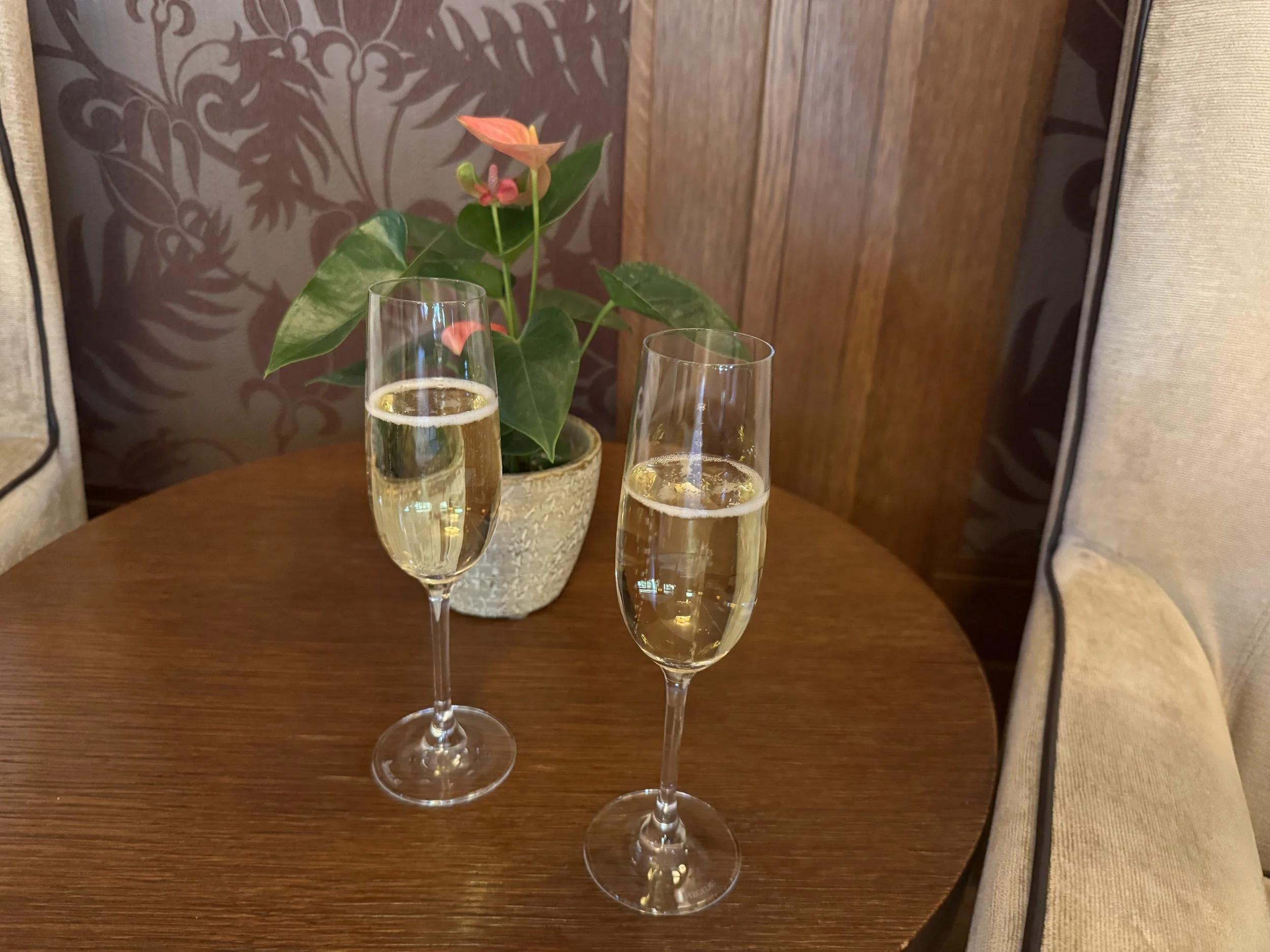 For whatever reason, check-in took over 15 minutes. At least we were offered some sparkling wine while we waited, which was actually a Kempinski-branded Sekt Extra Dry.