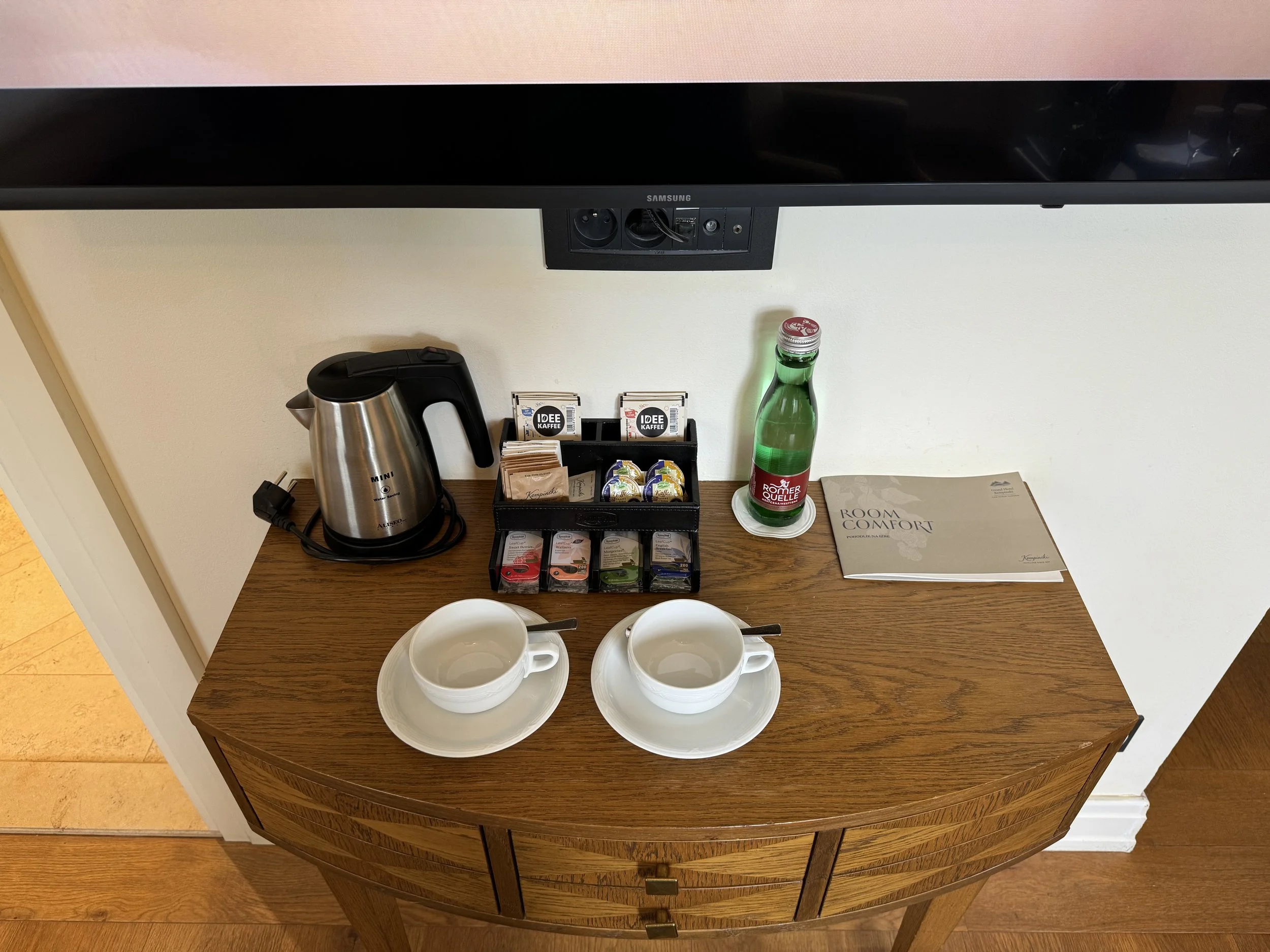 Adjacent to the living room was a credenza with a water kettle and some tea and coffee. Oddly, the coffee was instant.