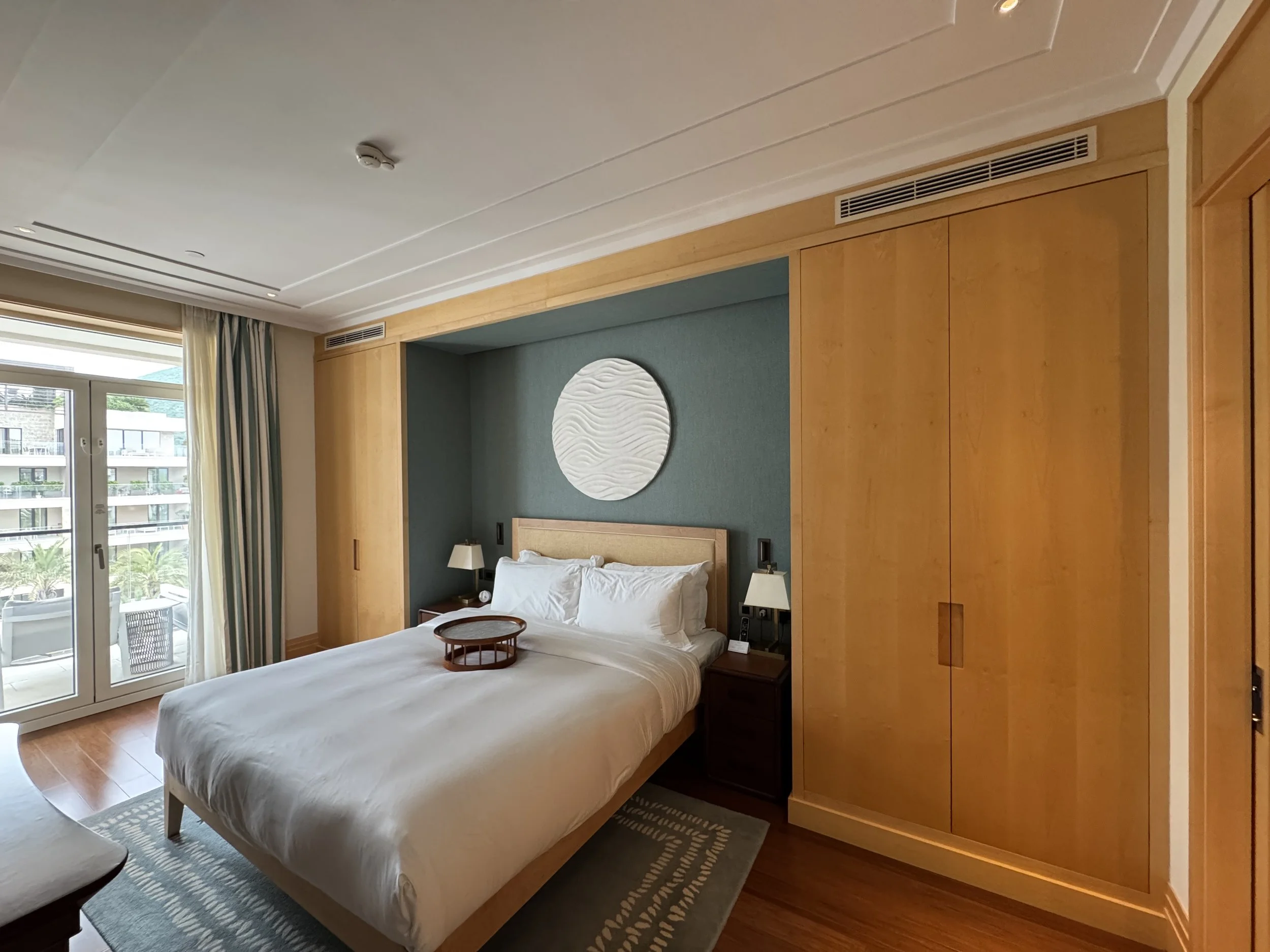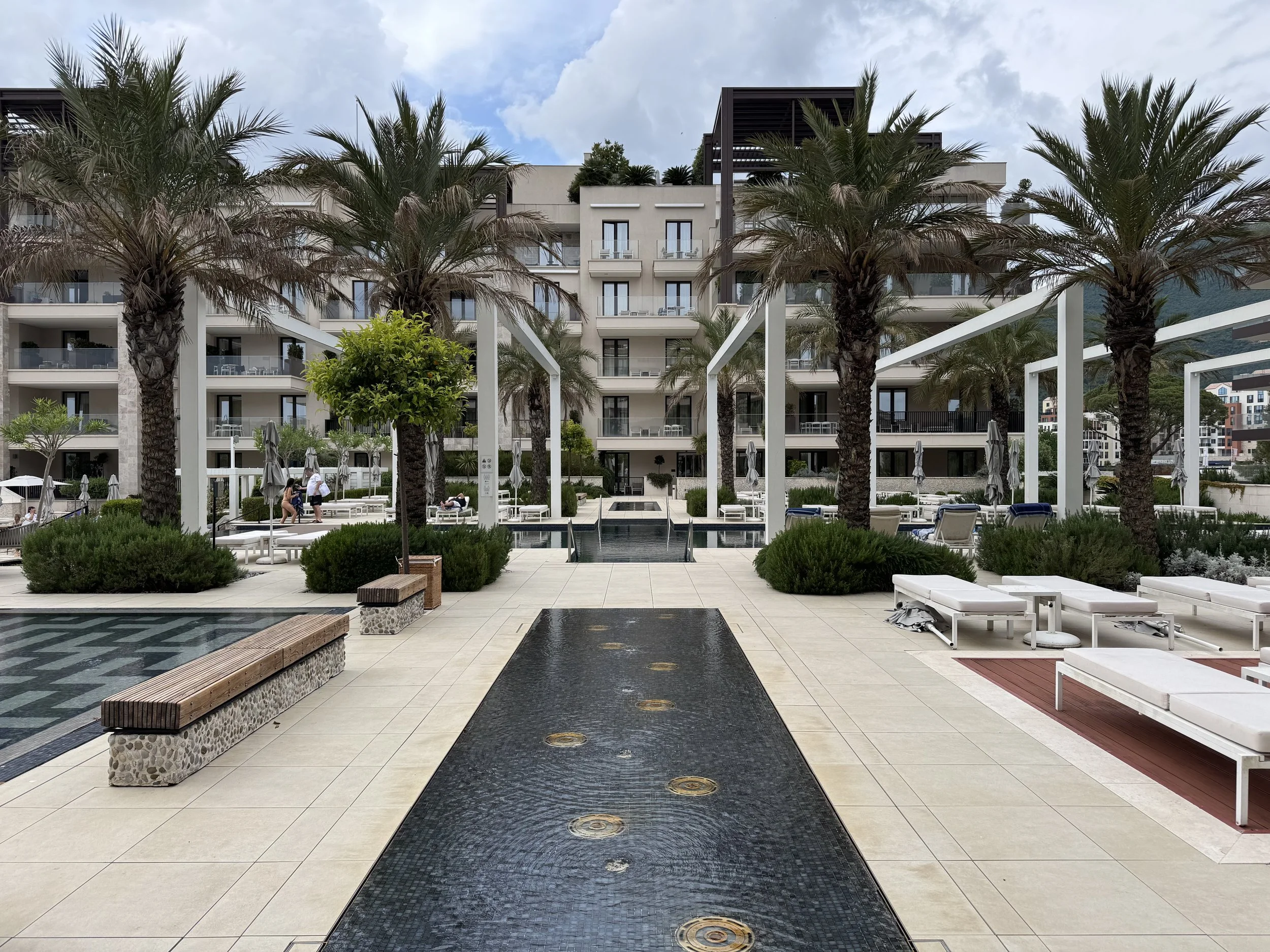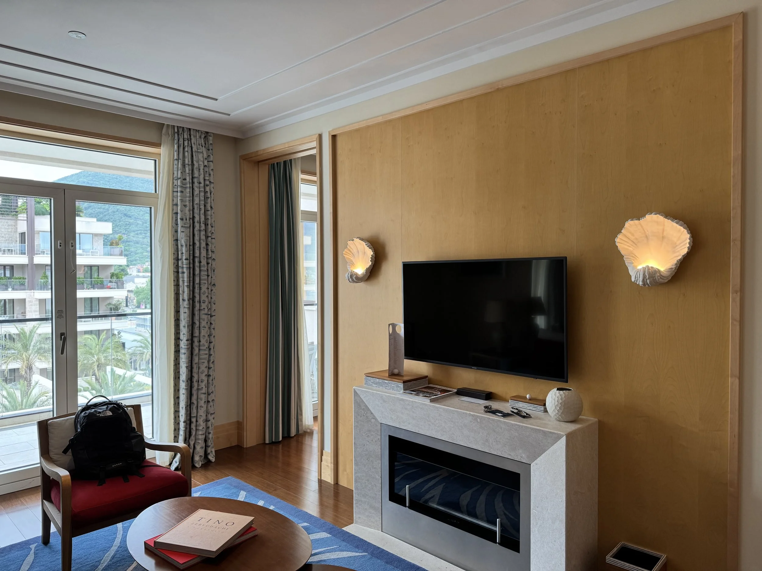 To get to our room, we first walked through the spa on the second floor. It was an odd layout, but I guess they had to connect the residence towers to the main building via a skybridge of sorts. The residence tower had a gorgeous atrium, and it was showered in natural light. The lobby had another water feature, with a very aesthetically trimmed tree planted in the center. Then four geometric globes were projected alongside the pond. The construction at the hotel felt very solid and upscale. Every time I visit a new country, I always wonder what the rich people in these countries do. Clearly there’s enough wealth in Montenegro to support a project like this.