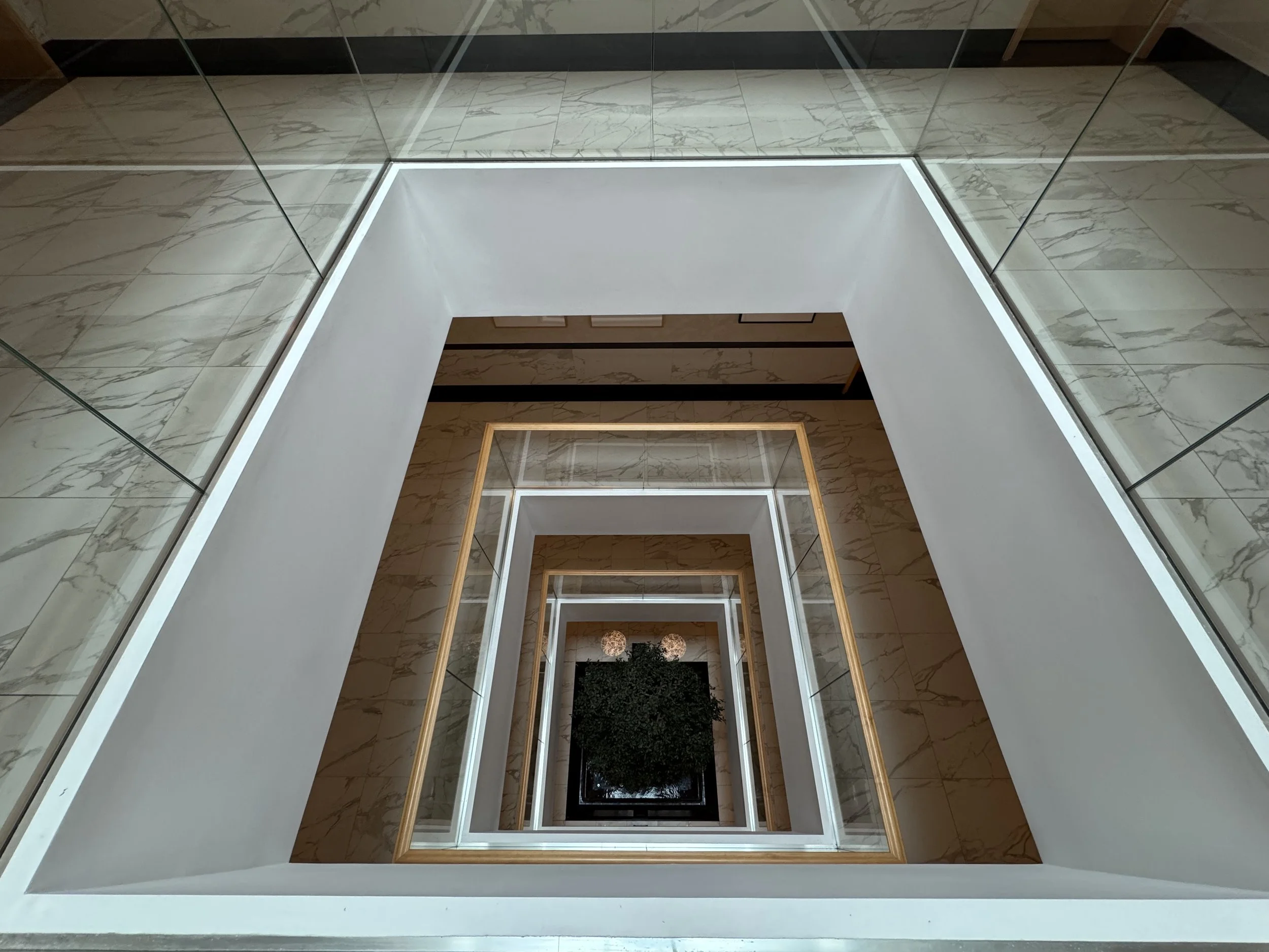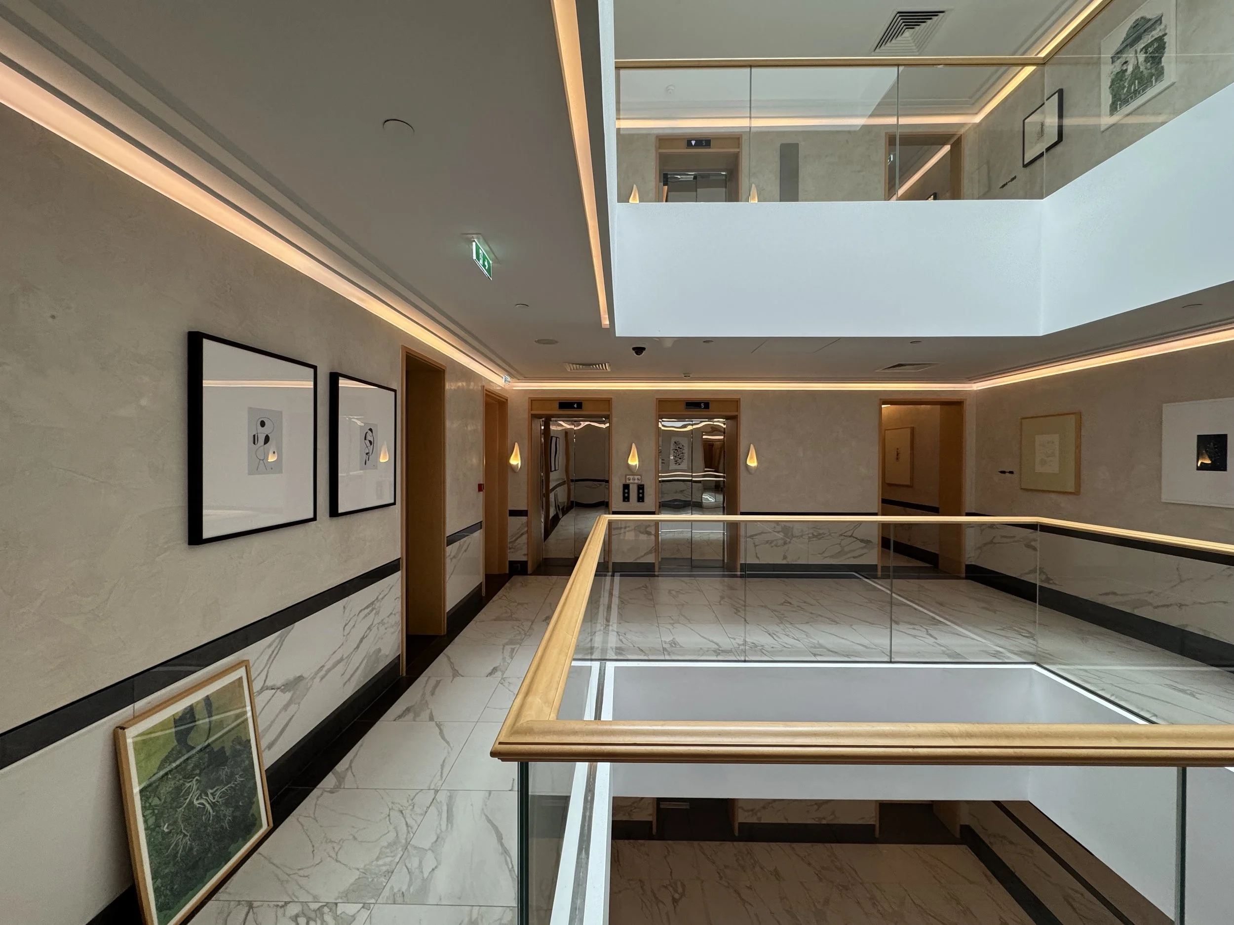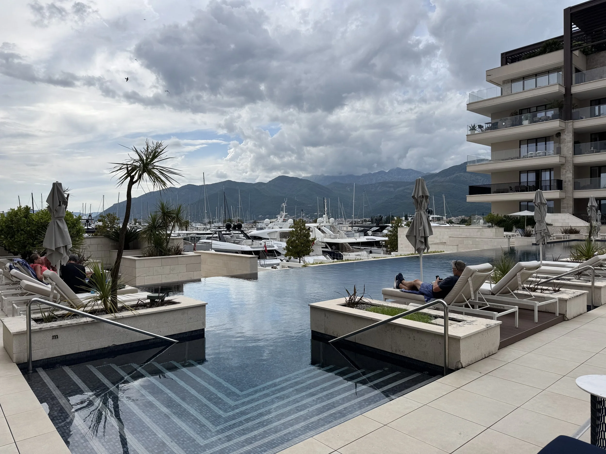 To get to our room, we first walked through the spa on the second floor. It was an odd layout, but I guess they had to connect the residence towers to the main building via a skybridge of sorts. The residence tower had a gorgeous atrium, and it was showered in natural light. The lobby had another water feature, with a very aesthetically trimmed tree planted in the center. Then four geometric globes were projected alongside the pond. The construction at the hotel felt very solid and upscale. Every time I visit a new country, I always wonder what the rich people in these countries do. Clearly there’s enough wealth in Montenegro to support a project like this.