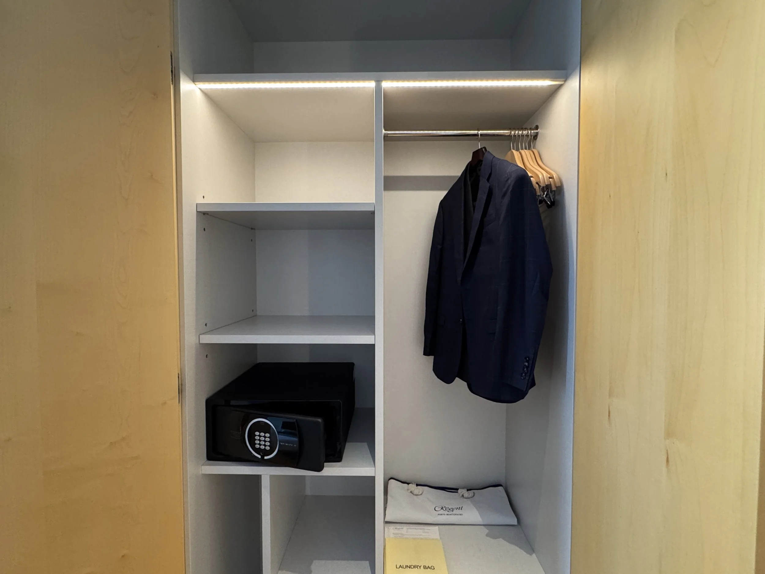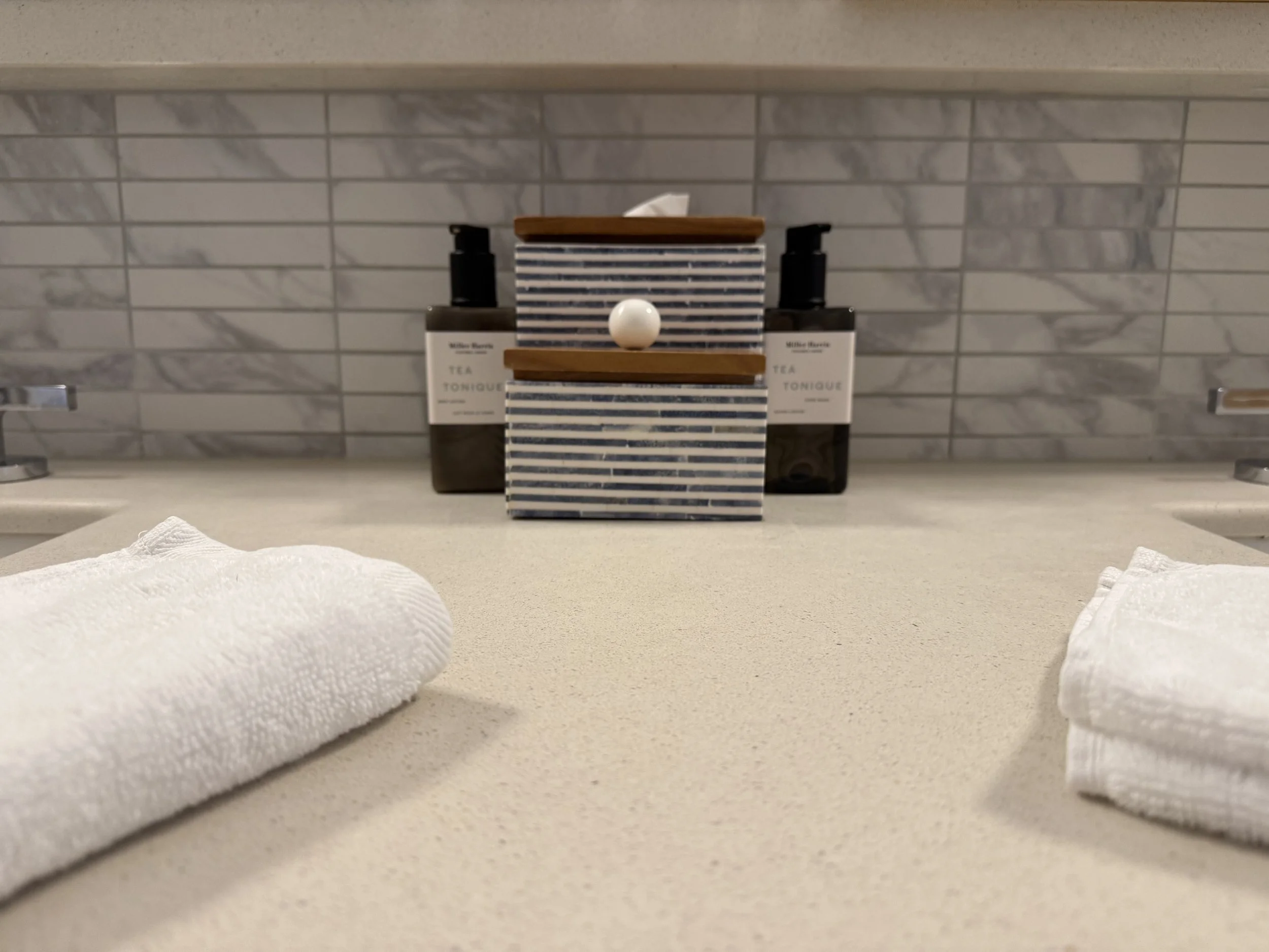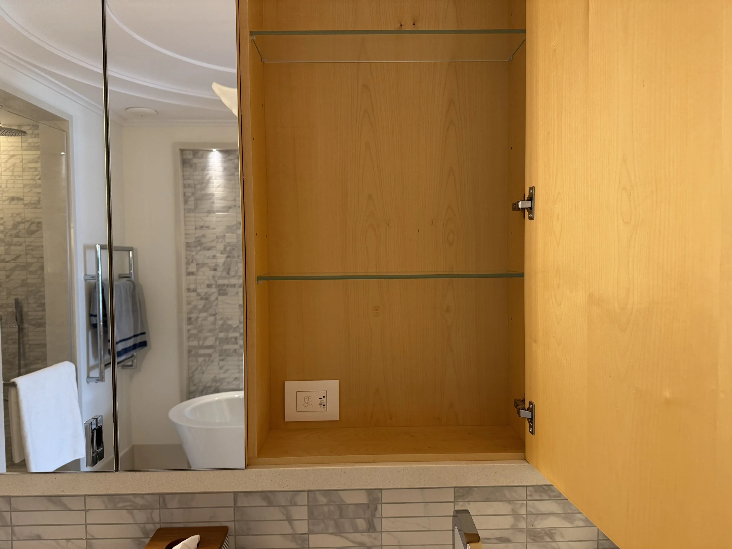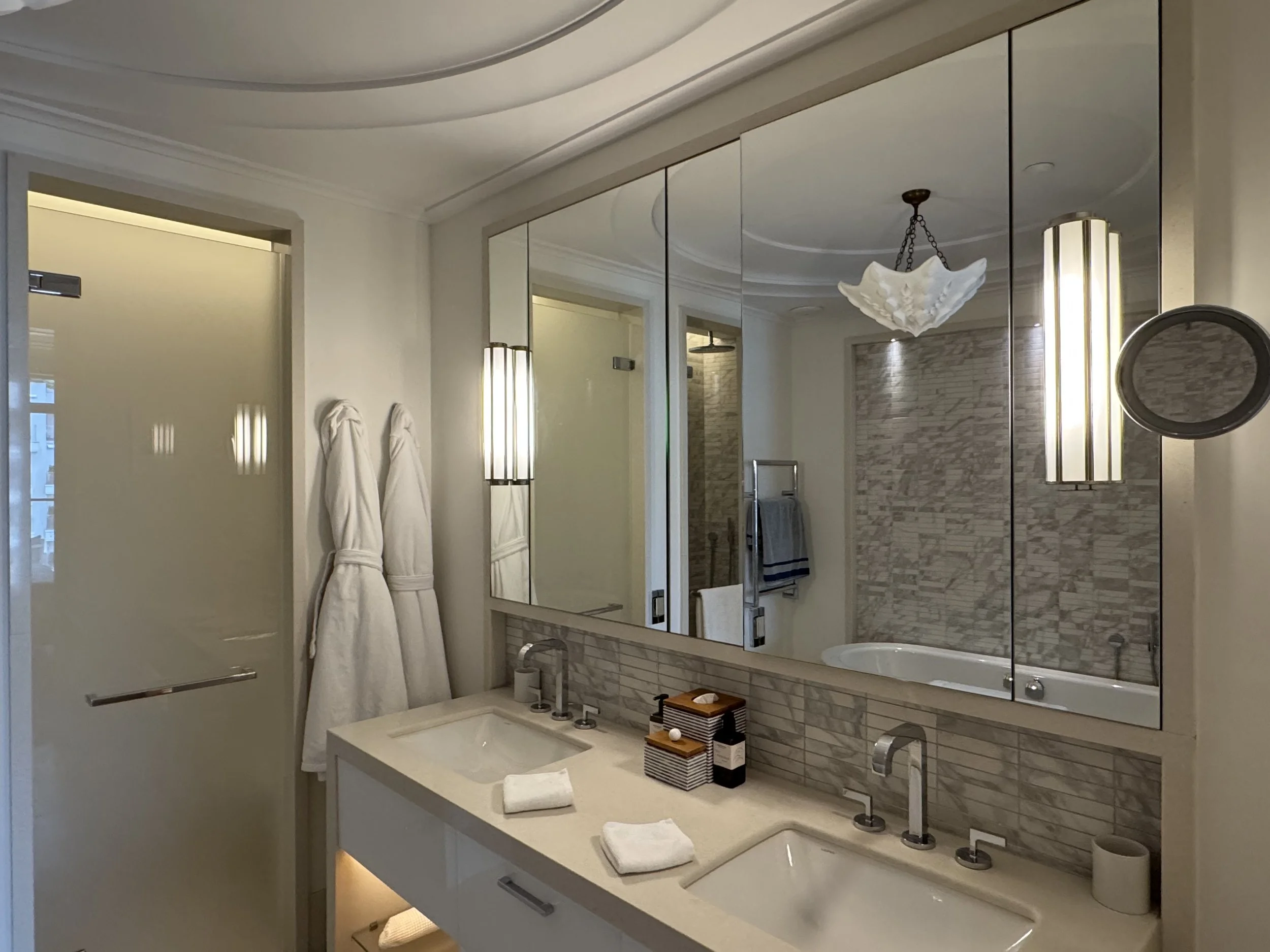 The bathroom was generously laid out, with dual-vanity and a soaking tub. I liked that since this was a residence unit, there were medicine cabinets behind the mirrors, so all my skincare products weren’t just spilled out onto the counter.