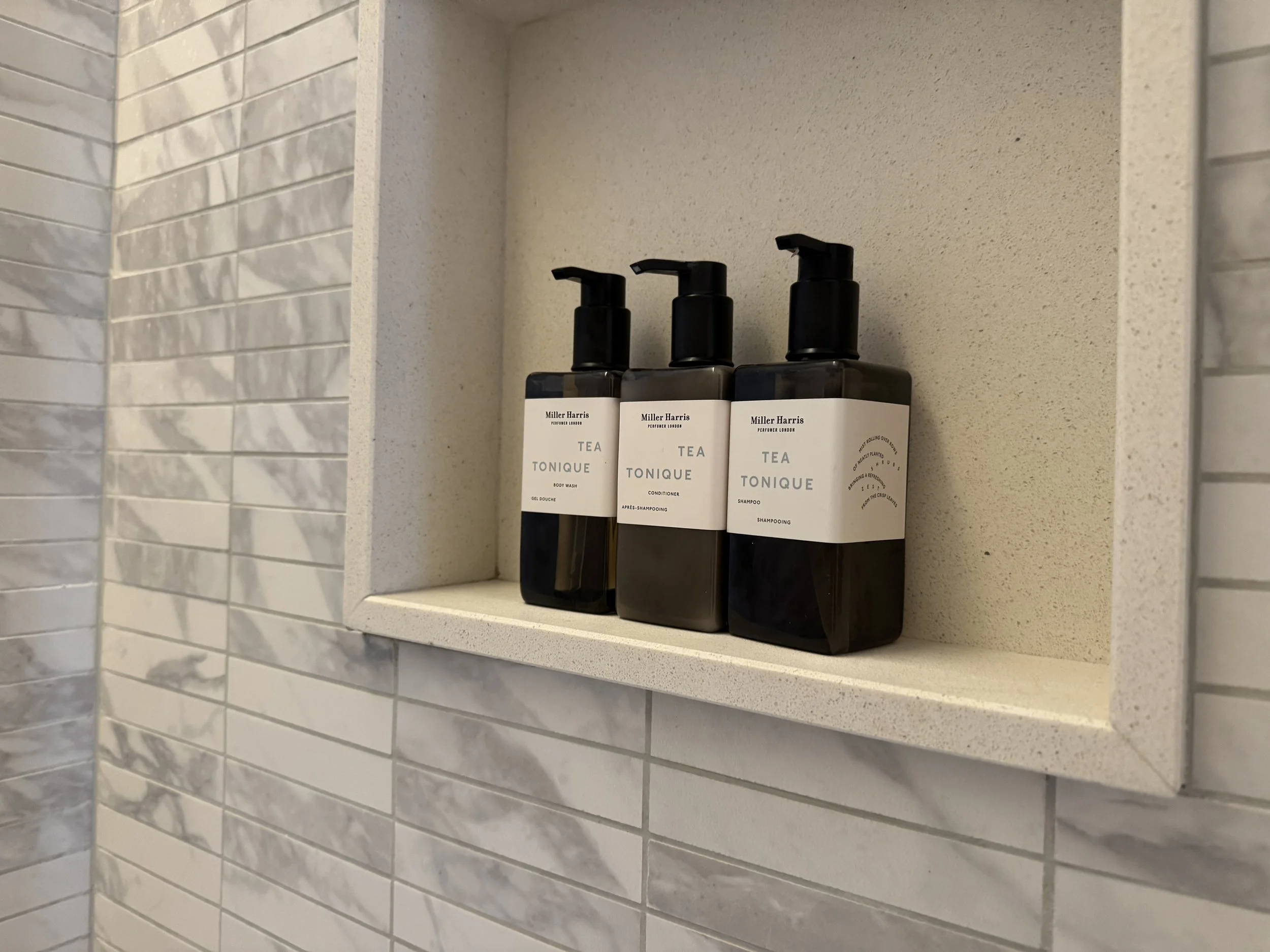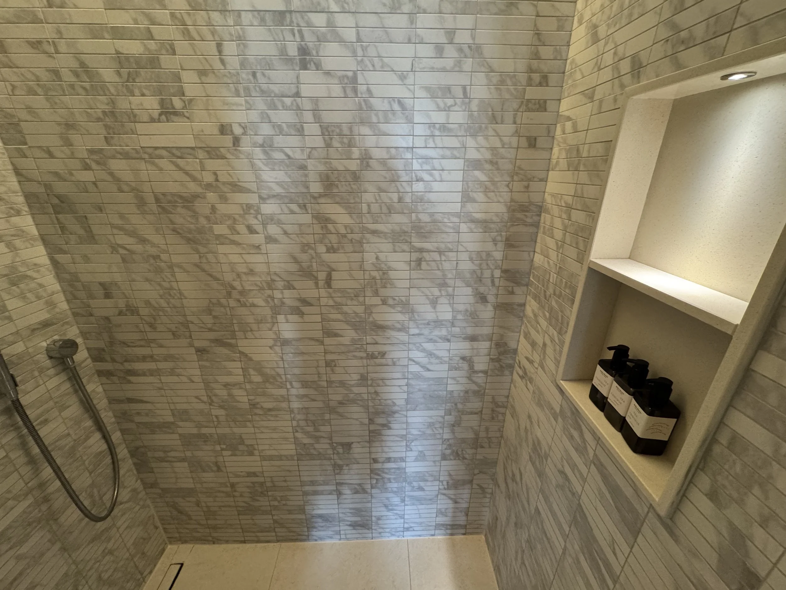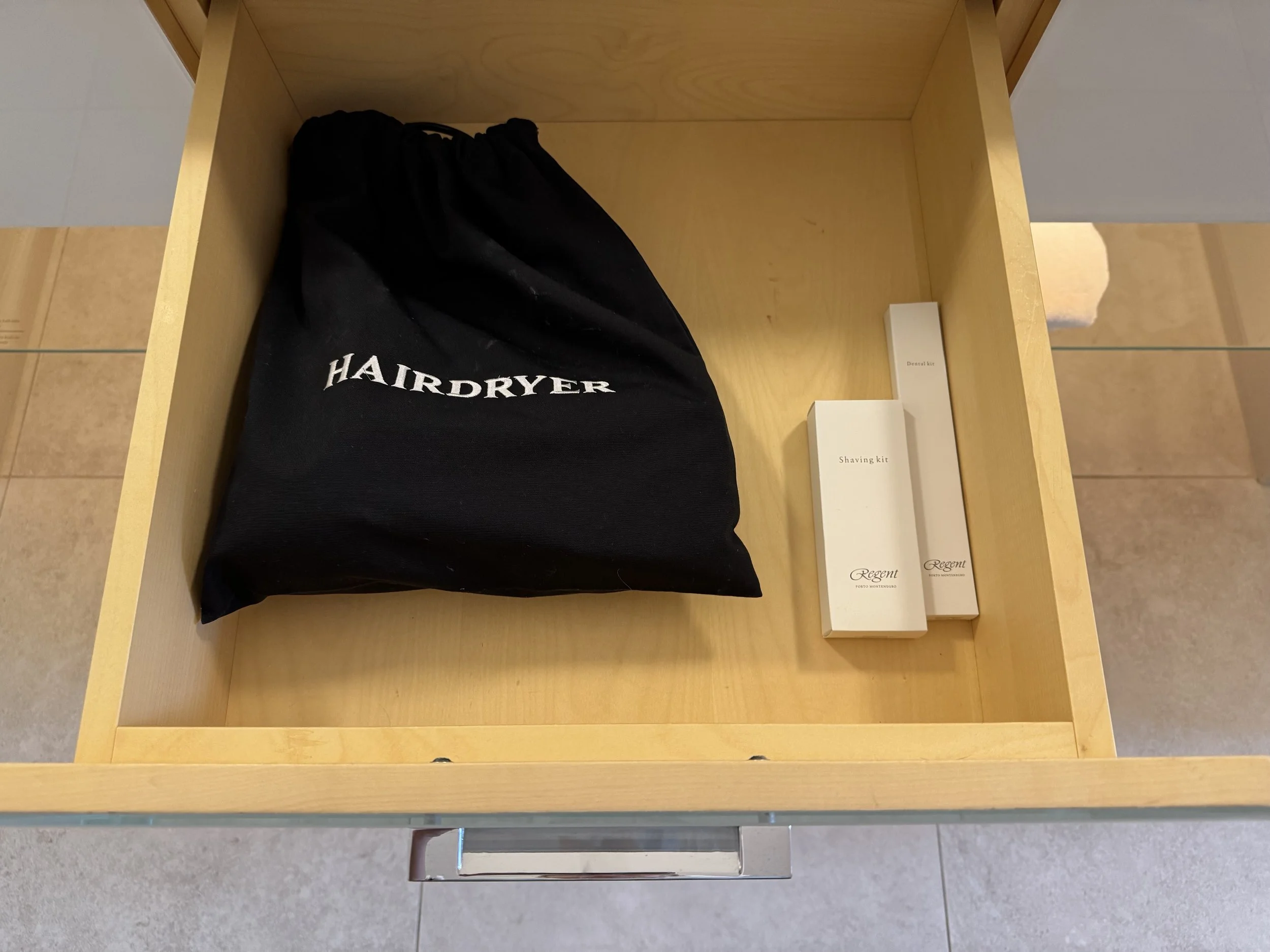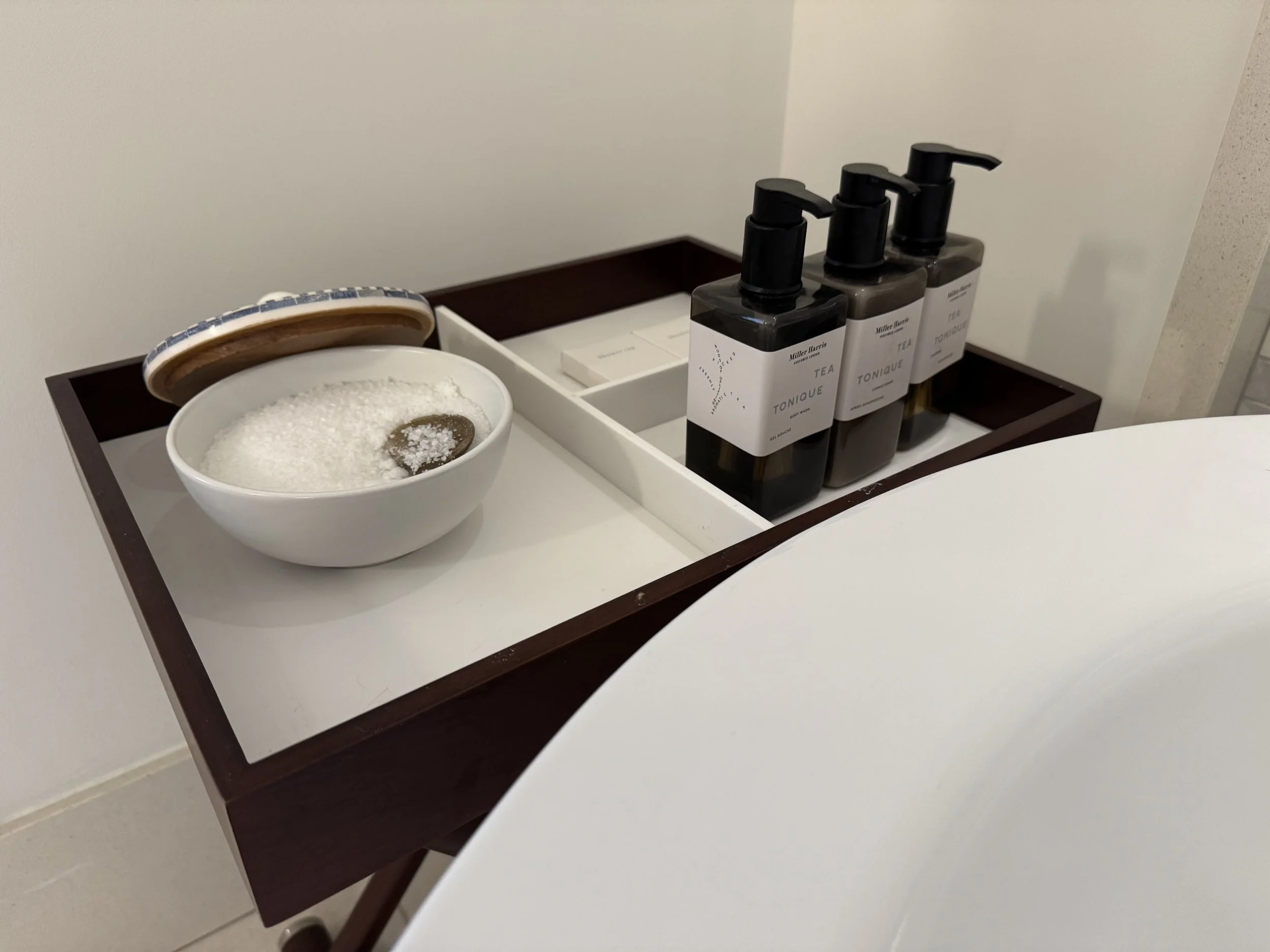 The bathroom was generously laid out, with dual-vanity and a soaking tub. I liked that since this was a residence unit, there were medicine cabinets behind the mirrors, so all my skincare products weren’t just spilled out onto the counter.