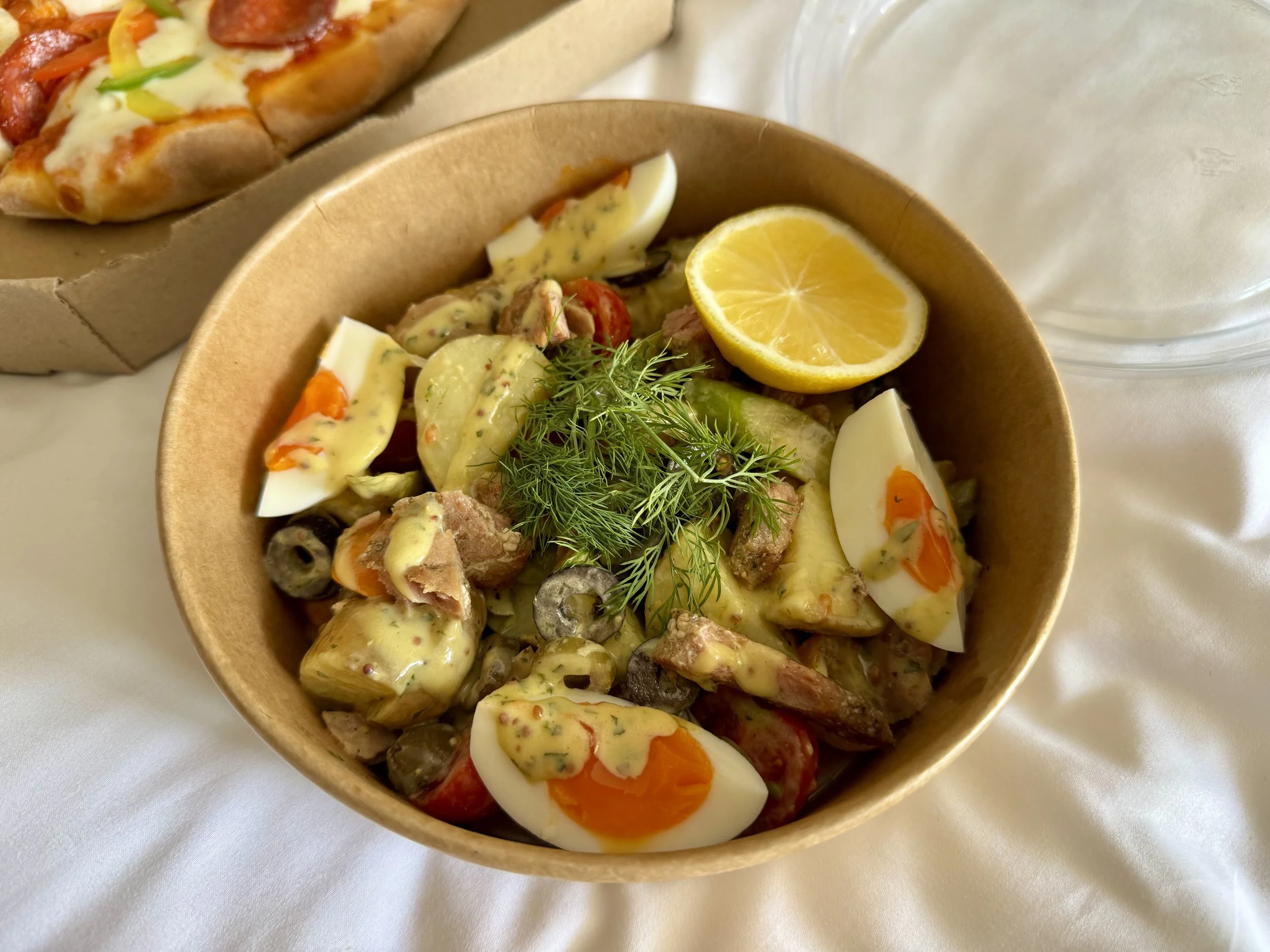 We picked up lunch from the pool bar one day. The tuna niçoise salad was delicious, while the pizza was just edible. The eggs in this salad were so so good.