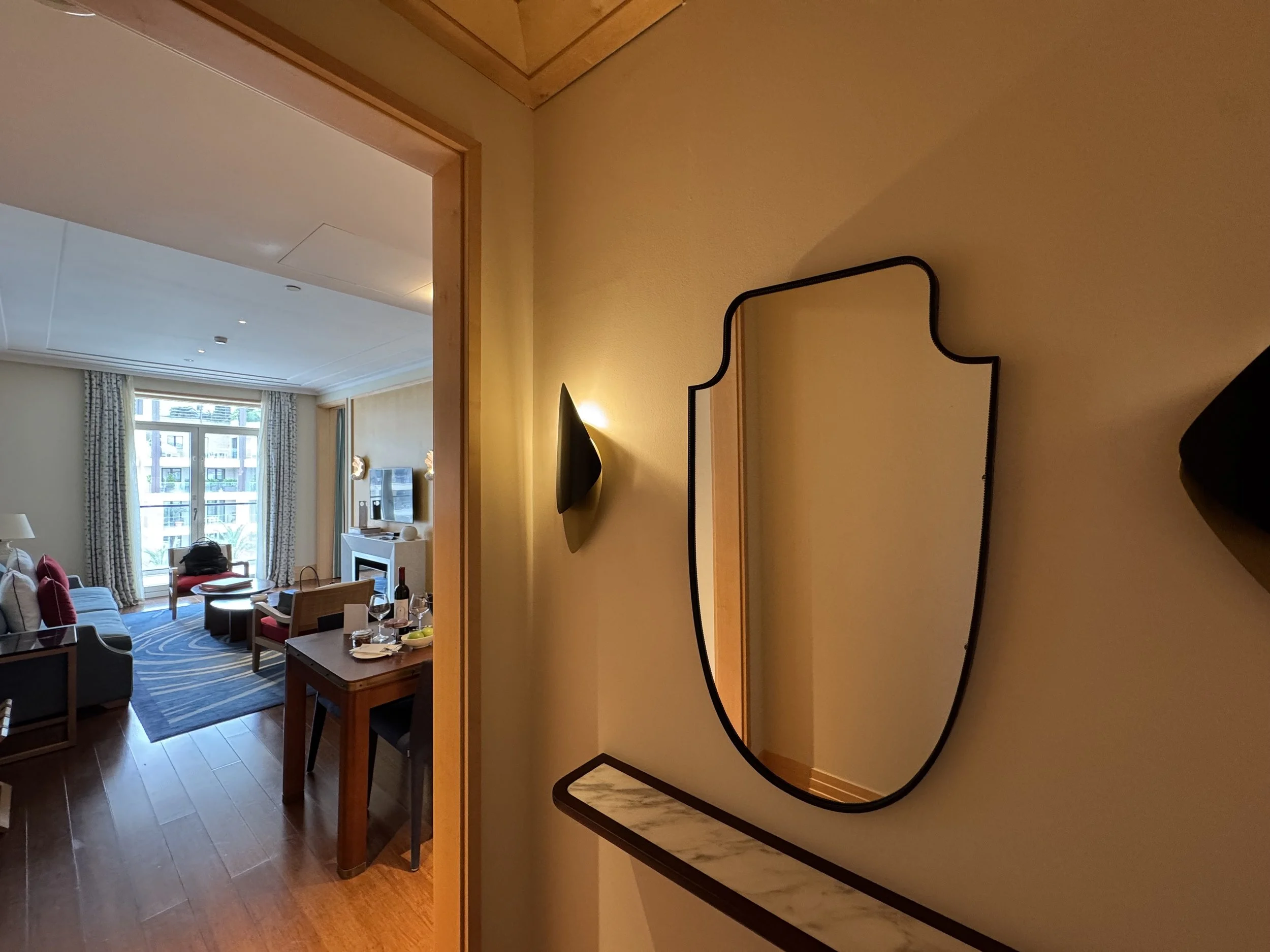 While our room was marketed as a studio suite, it technically met the definition of a one-bedroom suite, as the bedroom and the living room were fully separated. Upon entry, there was a small foyer with a mirror and a small shelf for tchotchkes.