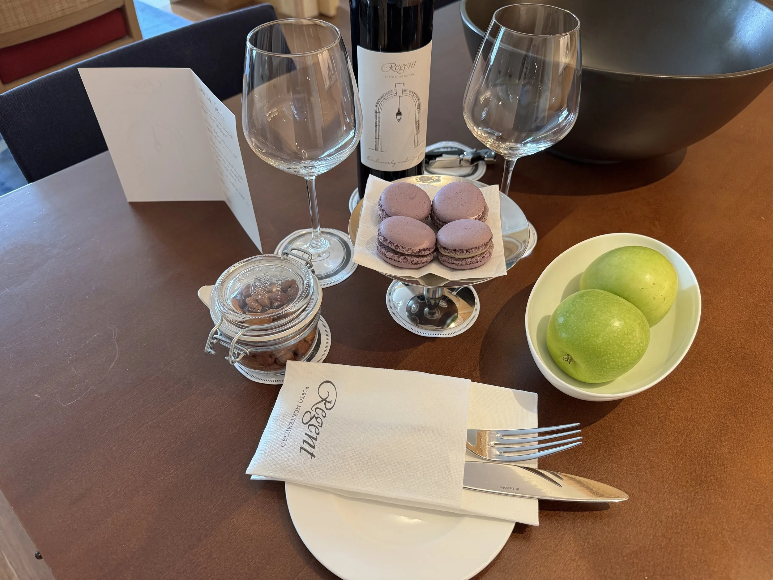Awaiting on the dining table was a decent welcome amenity, consisting of a bottle of Regent-branded Montenegrin wine, as well some macaroons, apples and nuts. I learned on this trip that the Adriatic Coast has a long history of viticulture, with relics of wine-making in the Montenegrin city of Budva dating back to the 4th century. I’ve had Albanian and Serbian wine before, but never Montenegrin or Croatian wine. We mistakenly assumed that we should be drinking whites here, but the reds such as Vranac were stellar. This gets to my point of how hotels and airlines can be great ambassadors of their homeland. Had the Regent not given us a bottle of Montenegrin red, I would’ve never sought it out on my own and fallen in love with it.