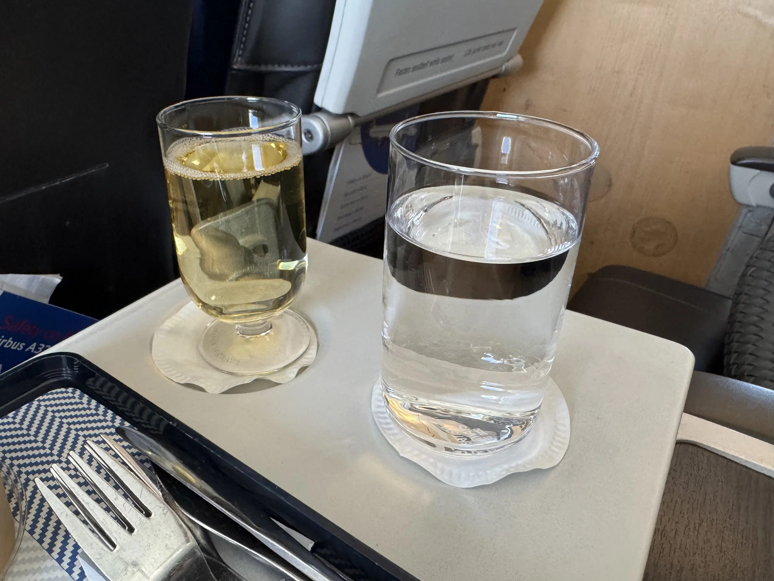 Drinks were served alongside the meal. I asked for sparkling water and champagne (I love carbonation, what can I say), which was the Pannier Brut. It was quite good. There was a father and son duo sitting in the row in front of me, and the father ordered champagne as well. The son (with English accent) went “Champagne? With breakfast?”, and both the flight attendant and I were cracking up.