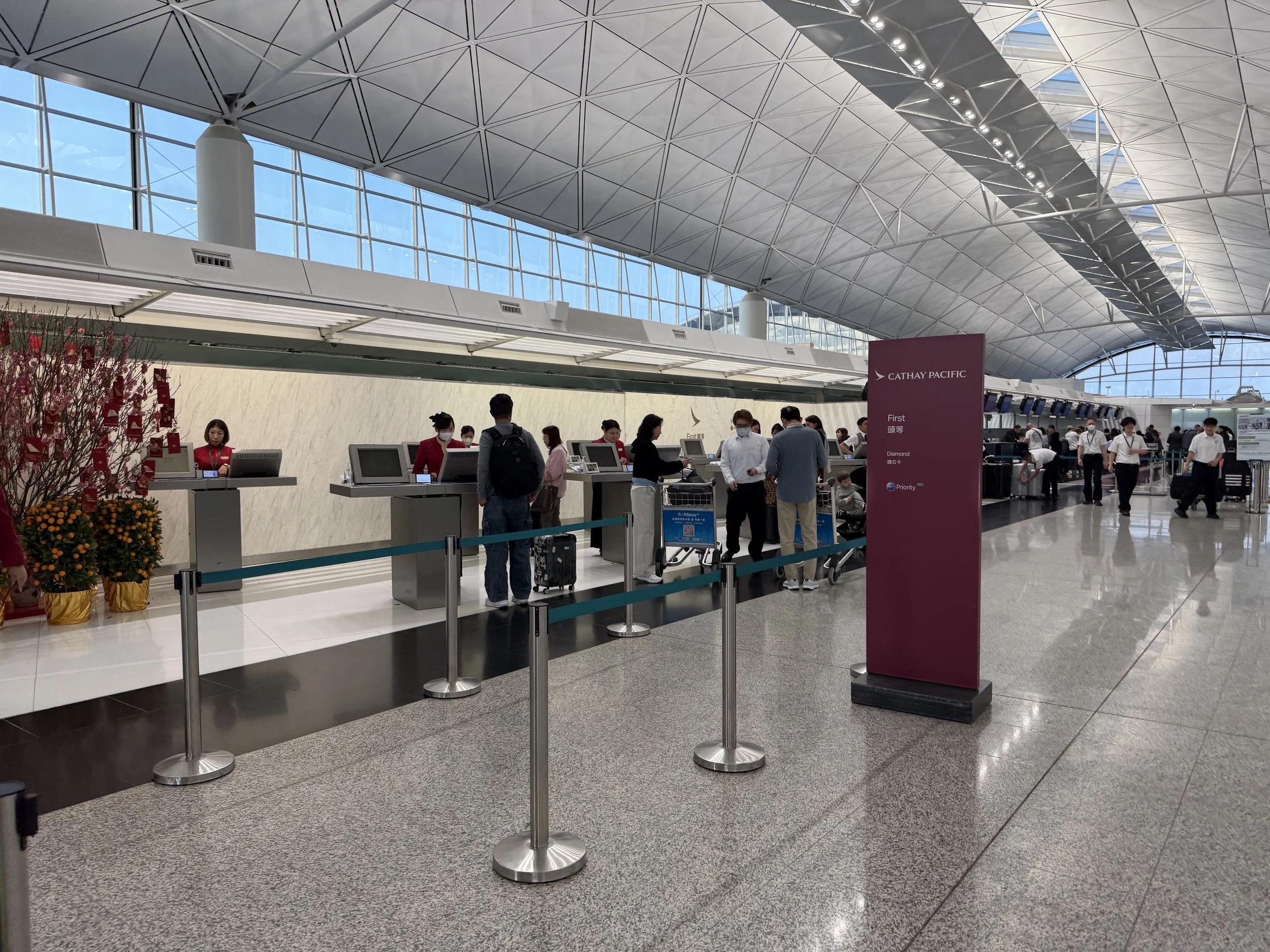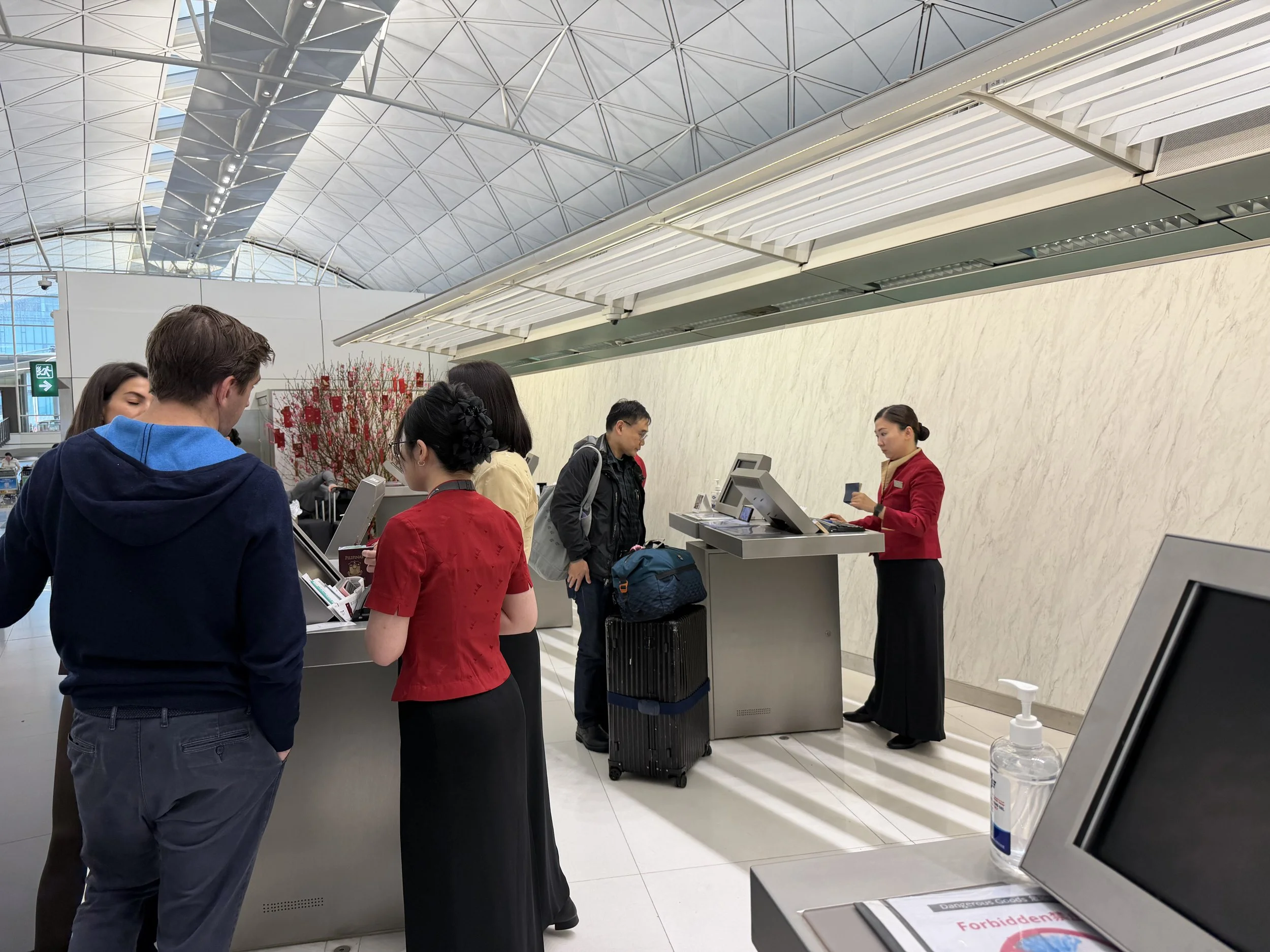 Following my first class flight from JFK, I connected onwards to Chengdu the next day. Cathay has these standing check-in kiosks for first class, which I thought were sleek, albeit not necessarily luxurious or private. The nice feature here is that you can just pass off your checked bags to the agents, and you don’t have to lift them up onto a belt. It also means they’re not even trying to weigh how heavy your bag is, lol.