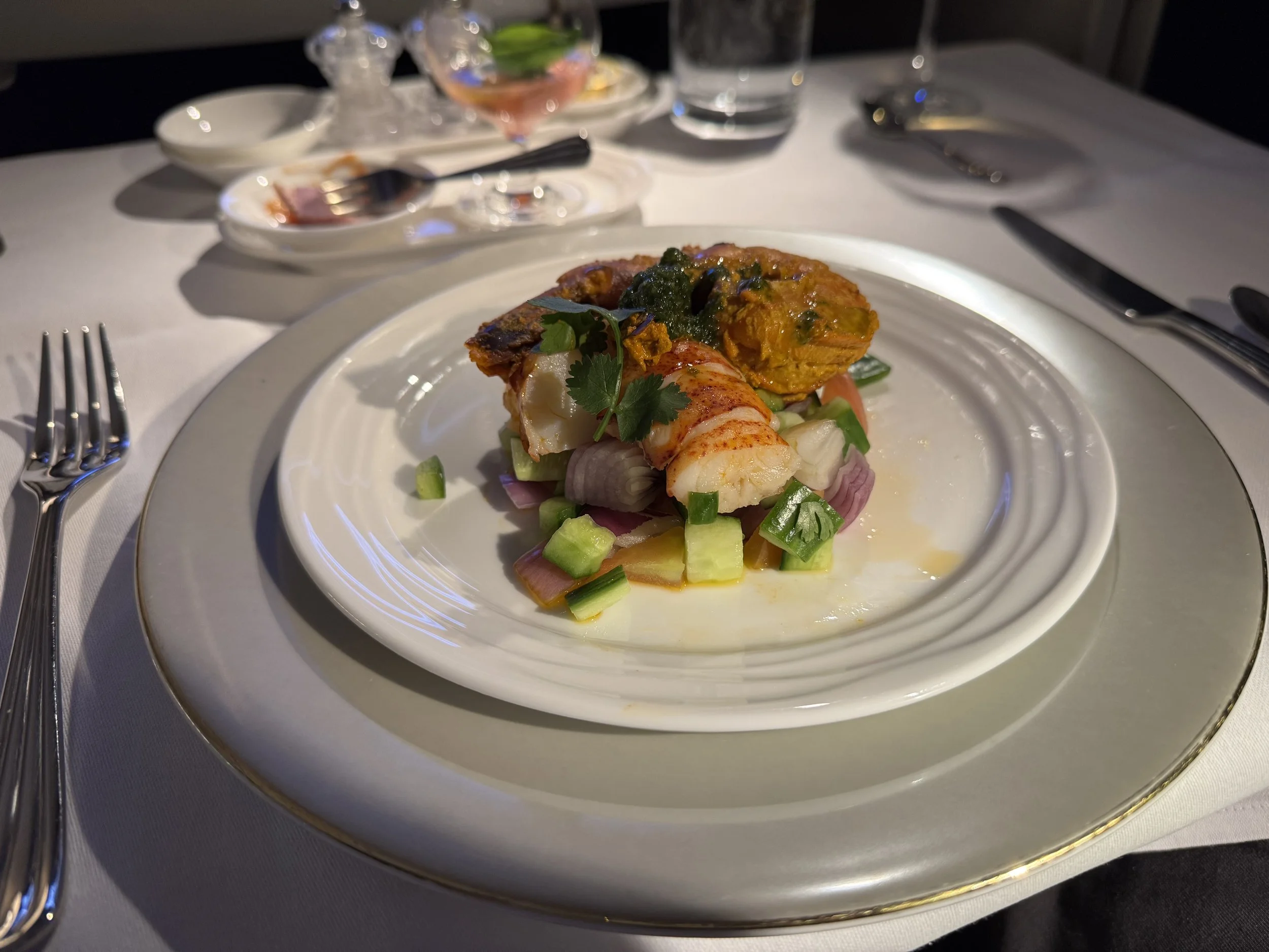 I was first offered amuse-bouche, which were some roast beef and shrimp with salsa. You could skip these. I find most airlines’ amuse-bouche to be disappointing, with the exception of Qatar, who usually serves some kind of scallops or lobster bites that were fresh and tasty.