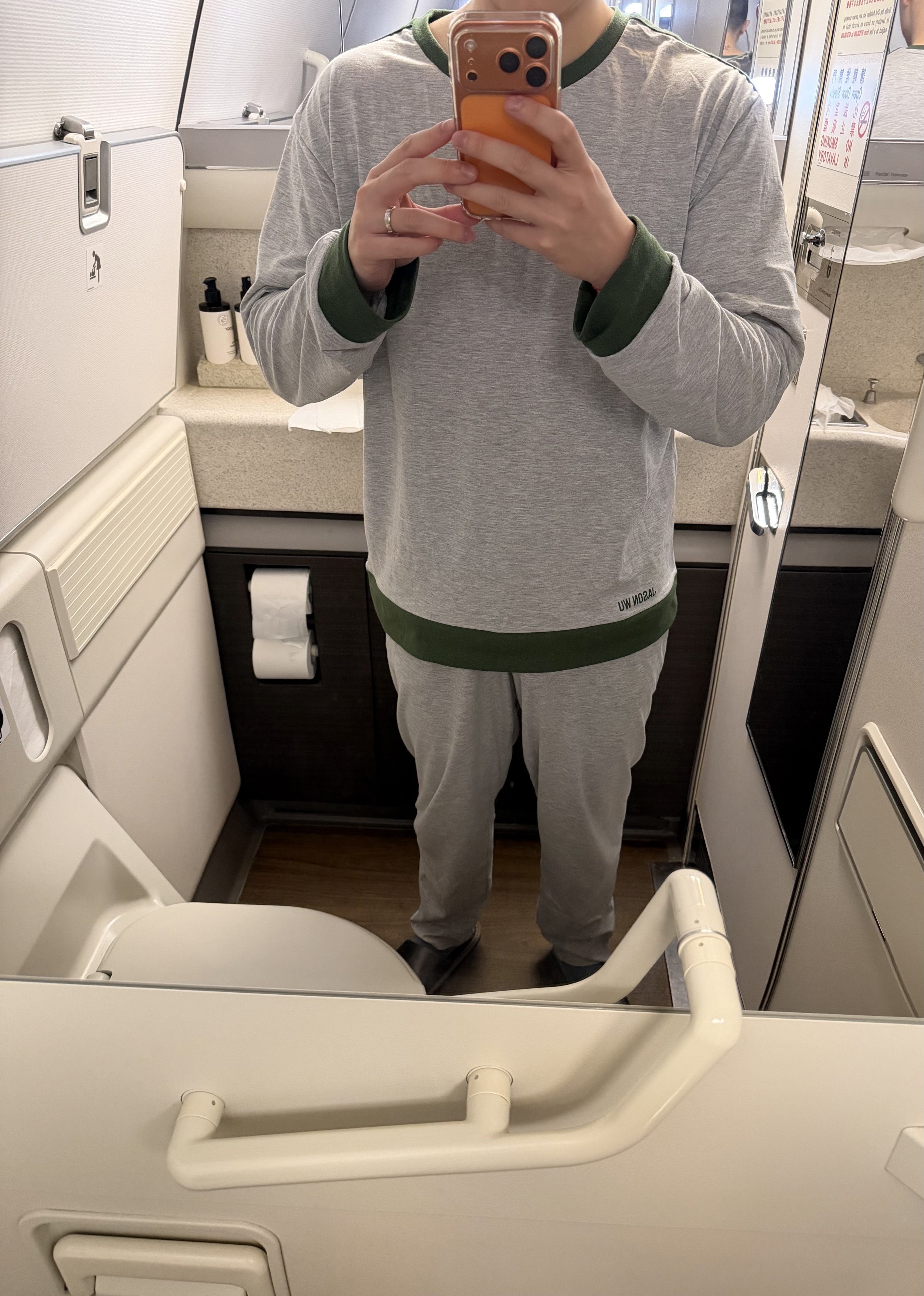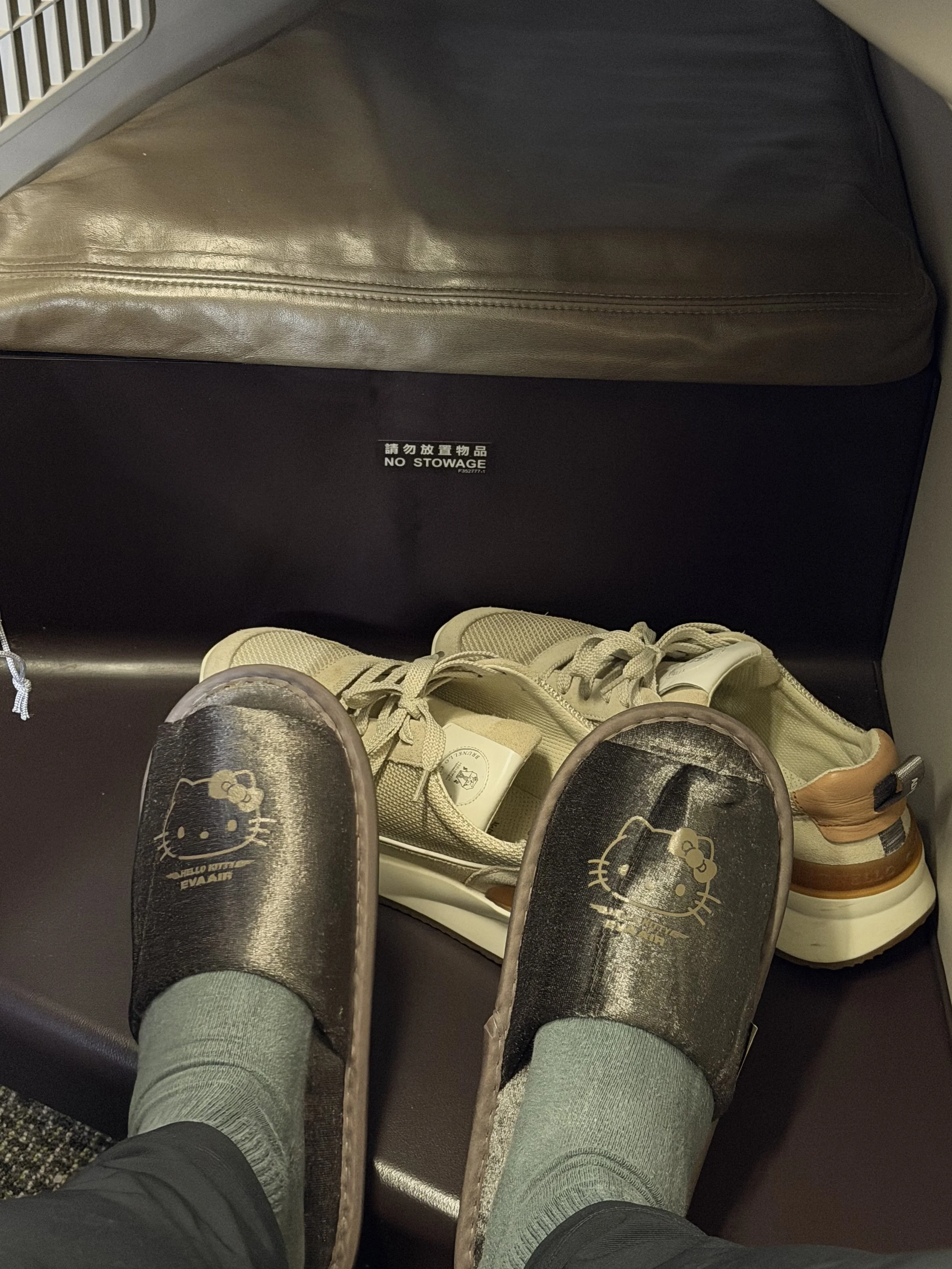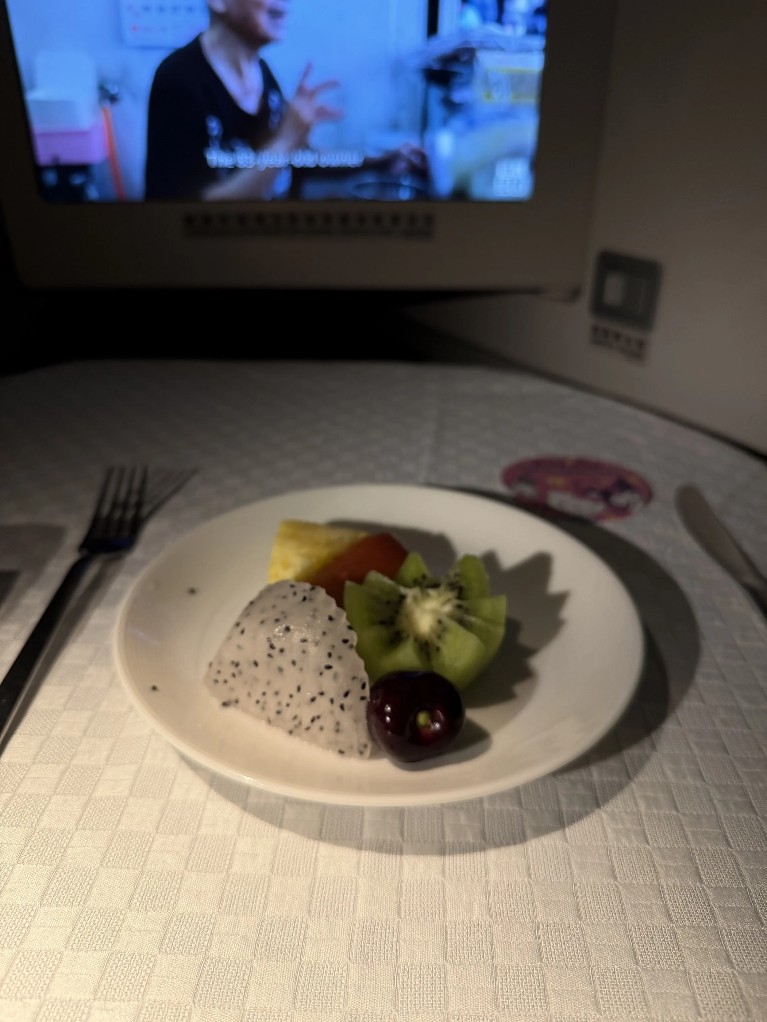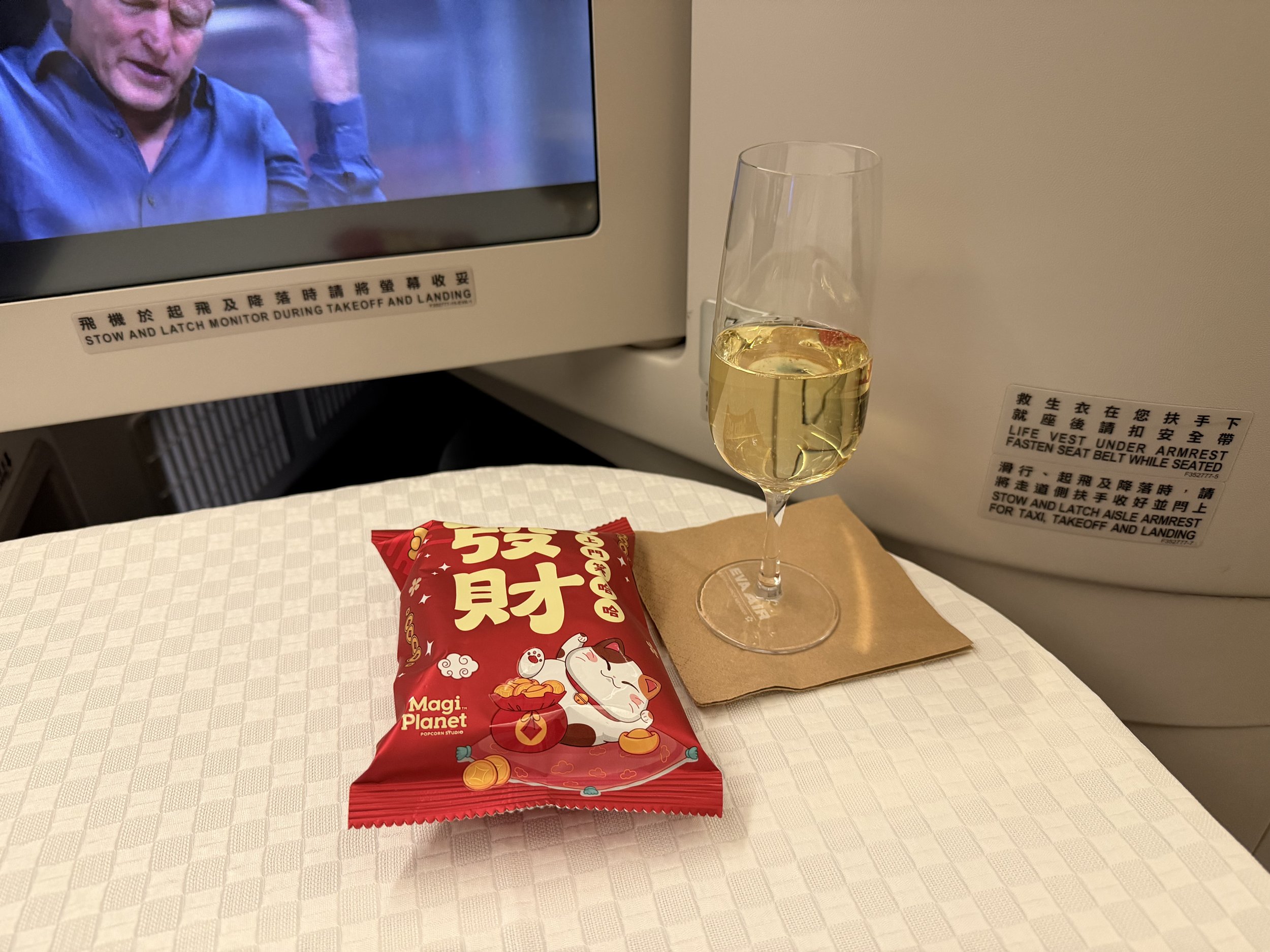 The FA collected the menu after she took my order, which I don’t recall EVA Air used to do. Business class ended up having two empty seats, and luckily they were around me. There was this girl sitting two seats over from me wearing an oversized hoodie and giant sunglasses. She was asleep from takeoff to landing. I thought she was some kind of Taiwanese actress, but she got into a full EVA uniform on our descent. I’m so nosy, lol. Surprisingly, premium economy behind us was half empty.