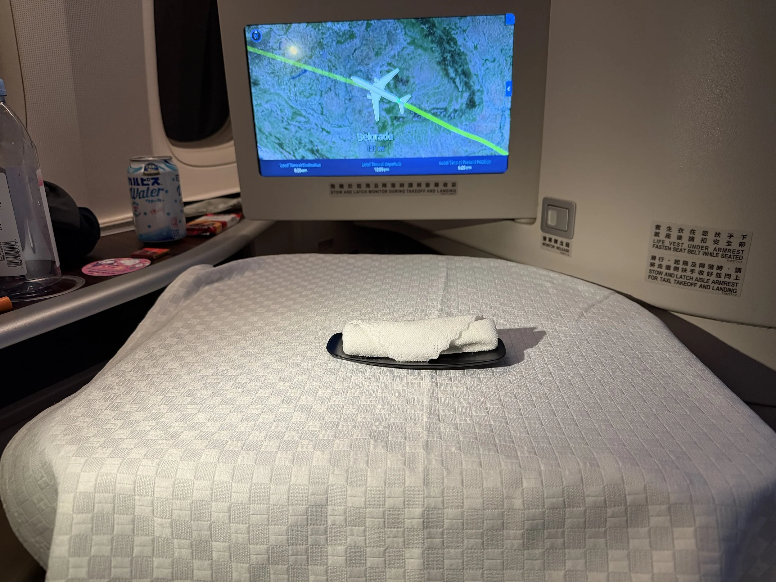 Since Taiwanese could not fly over the Chinese airspace when not flying to China, the circuitous flight path adds a couple hours to the journey. I eventually woke up around two hours before landing, as we were flying over Belgrade.