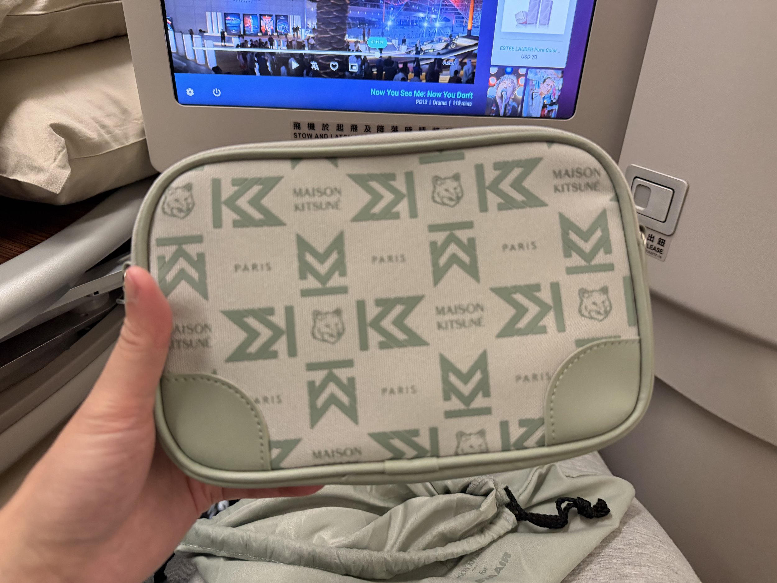 Business class amenity kit has changed from Ferragamo to Maison Kitsuné. I guess you have to save money somewhere… A trend I’ve noticed lately is that when airlines offer slippers, they no longer offer socks. Am I the only one who thinks they should be complementing and not substituting?