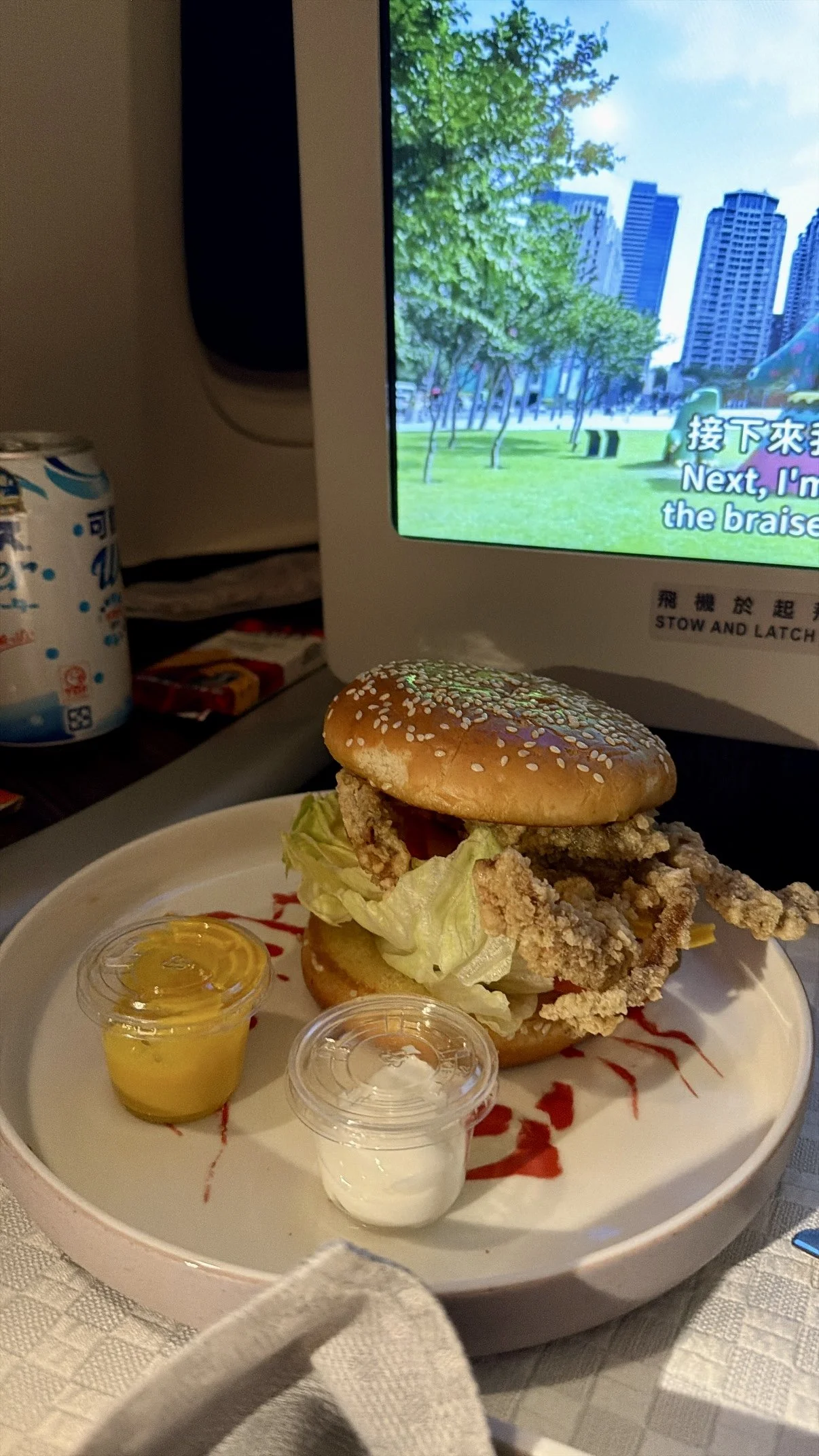 I saw the softshell crab burger from the snack menu and had to try it out. The plastic ramekins were definitely off-brand for EVA Air. The fried crab was expectedly soggy, but the bread was perfectly pillowy.