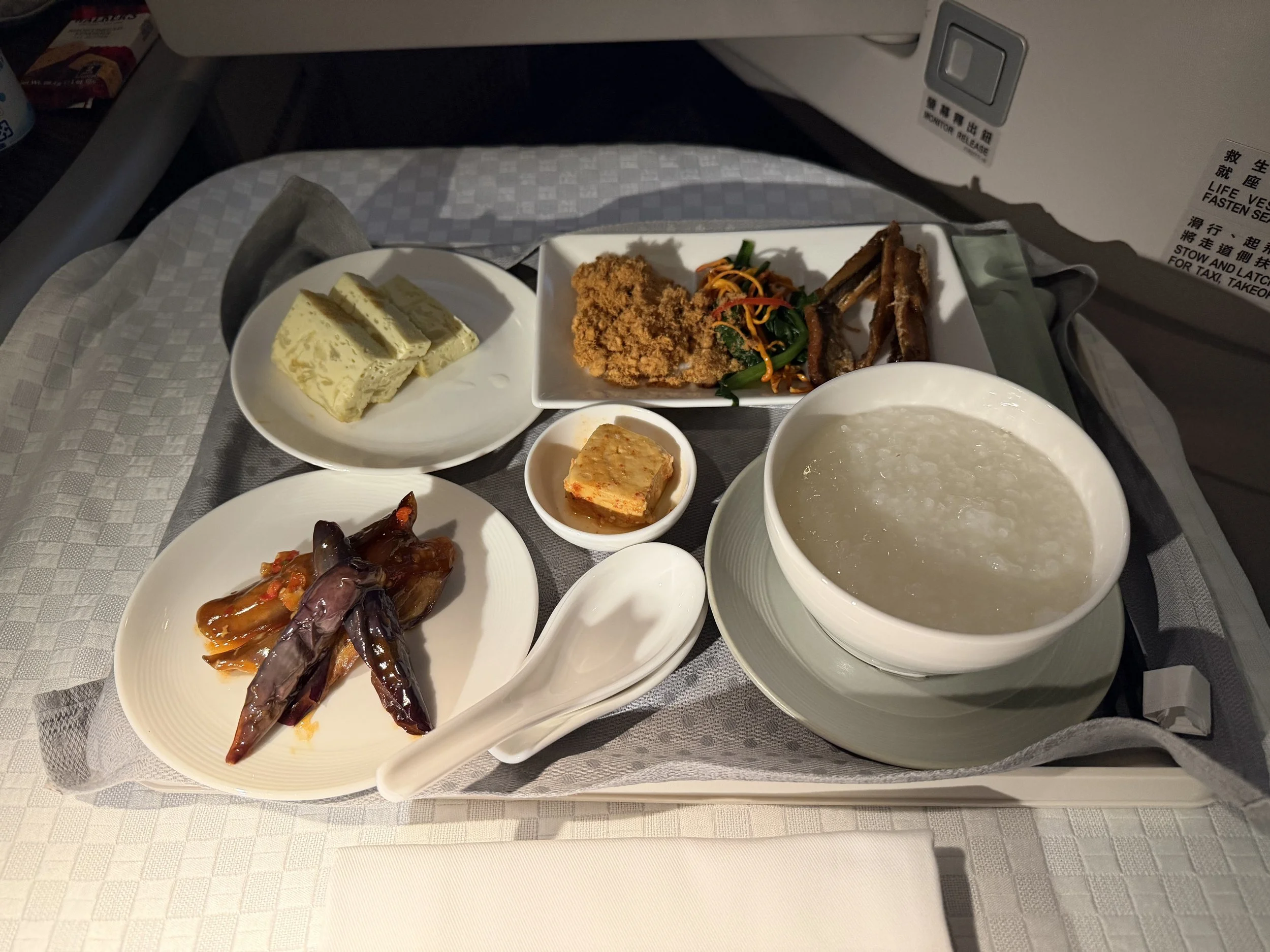 I love taro, so this was right up my alley. It’s amazing to have this kind of unique items on a flight. For breakfast, I went with the Chinese congee set with yu-xiang eggplant, cabbage frittata and traditional accompaniments.
