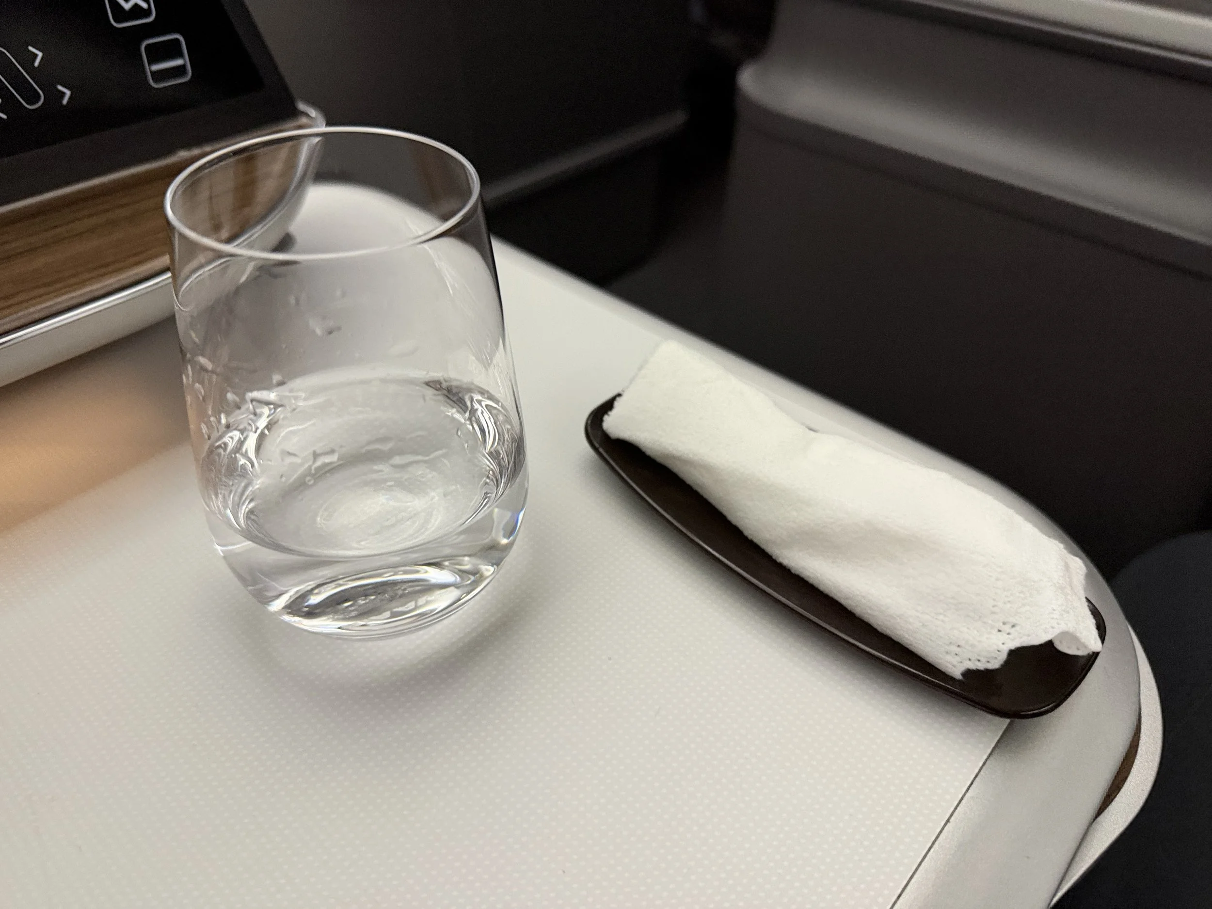 Given the short duration of the flight, service had to start quickly. A round of apéritif was still offered ahead of dinner. I just had some sparkling water. This was served with a cold towel, on a towel dish, naturally.