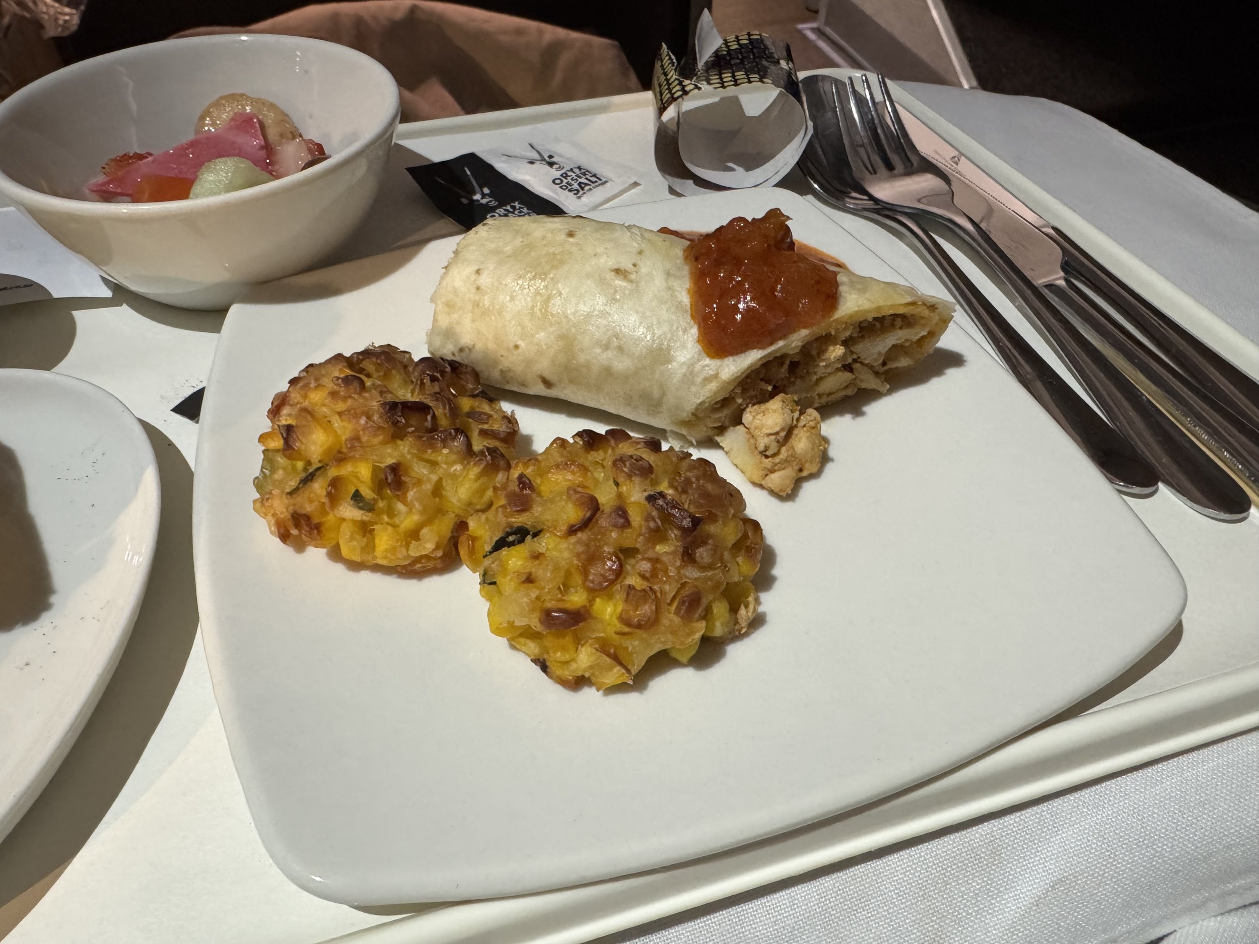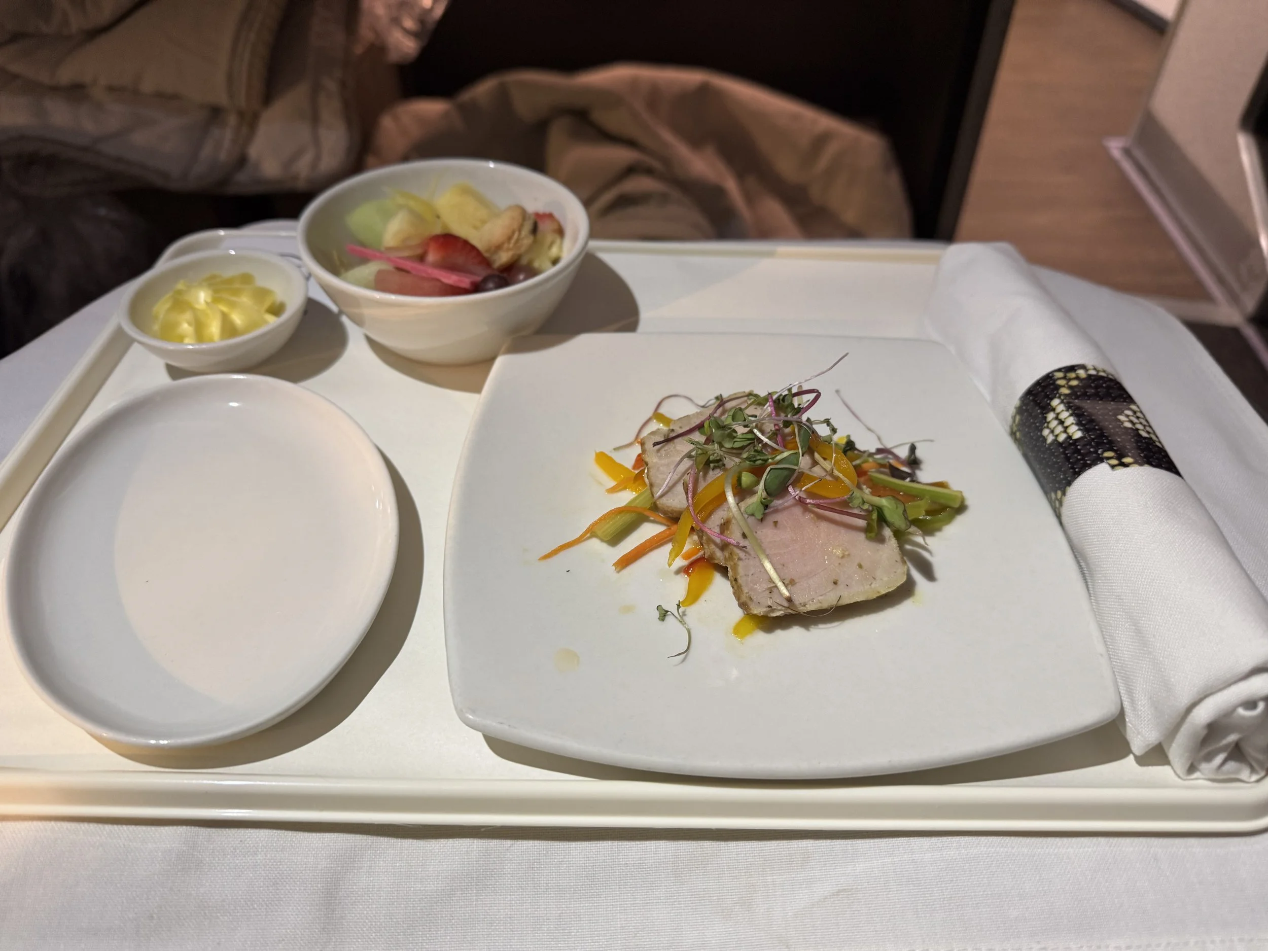 Prior to making landfall in Brazil, a pre-arrival meal was served. The options were either a power bowl or a spicy chicken tortilla wrap. Unlike on most northern transatlantic flights, SAA served an appetizer with the pre-landing meal. I had the grilled tuna slices, which was okay.