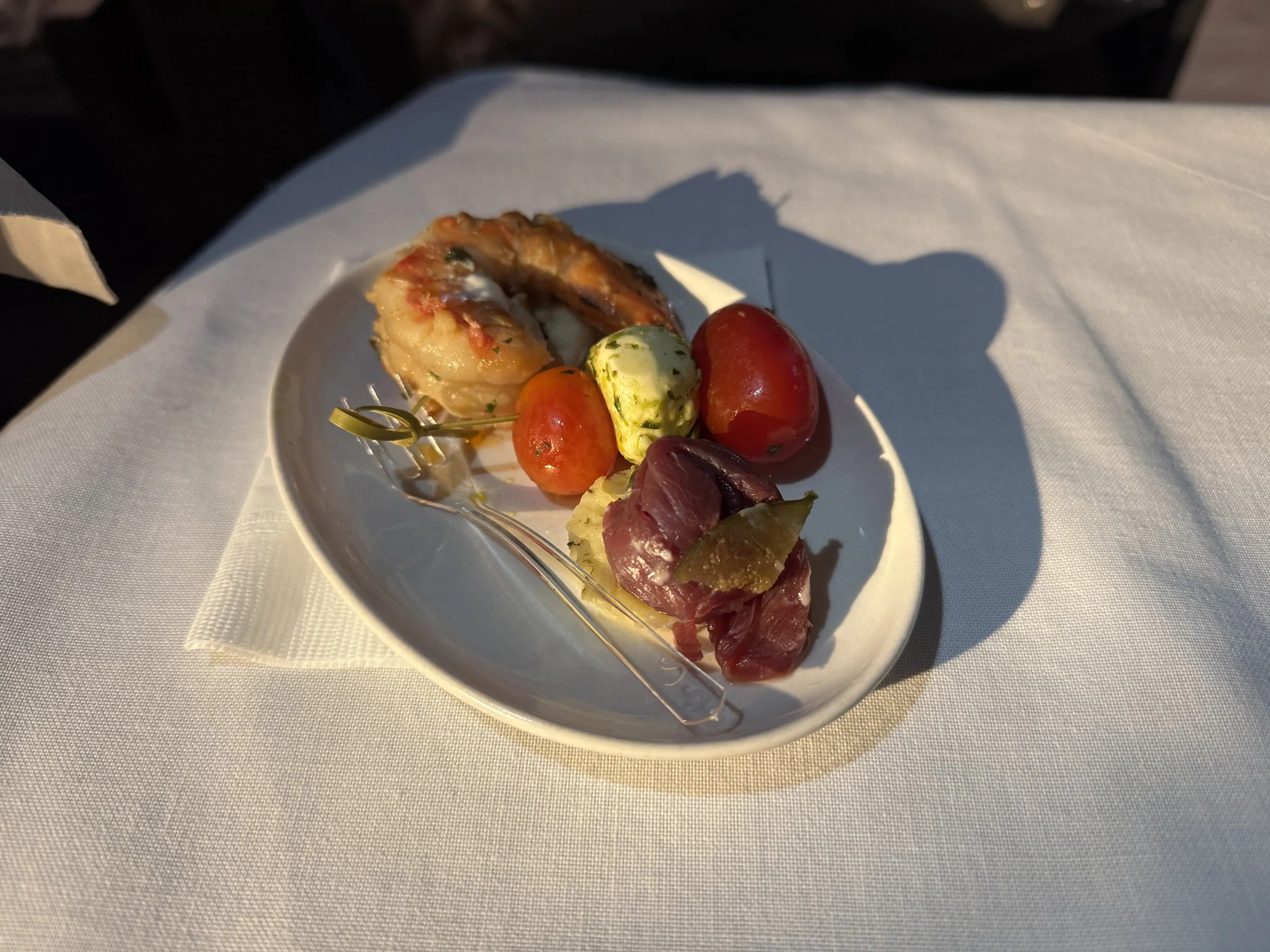 Eventually the trolley carts were rolled down the aisle, a universal signal of thrilling festivities. Lunch started with a shrimp amuse-bouche.