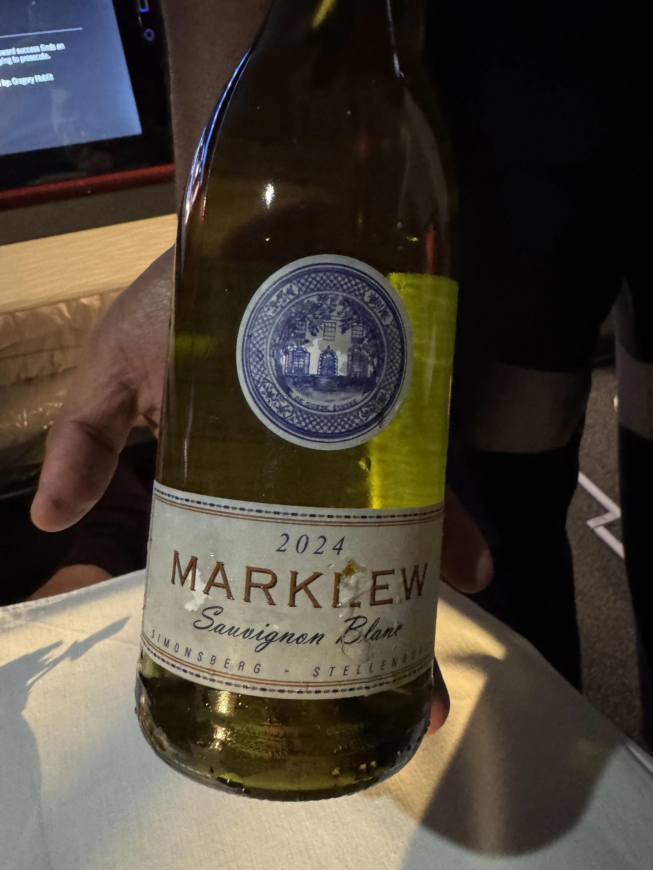 I was then offered a choice of beverage. I asked for a South African white and was presented with the Marklew sauvignon blanc. For a sub $10 bottle, it was not offensive.