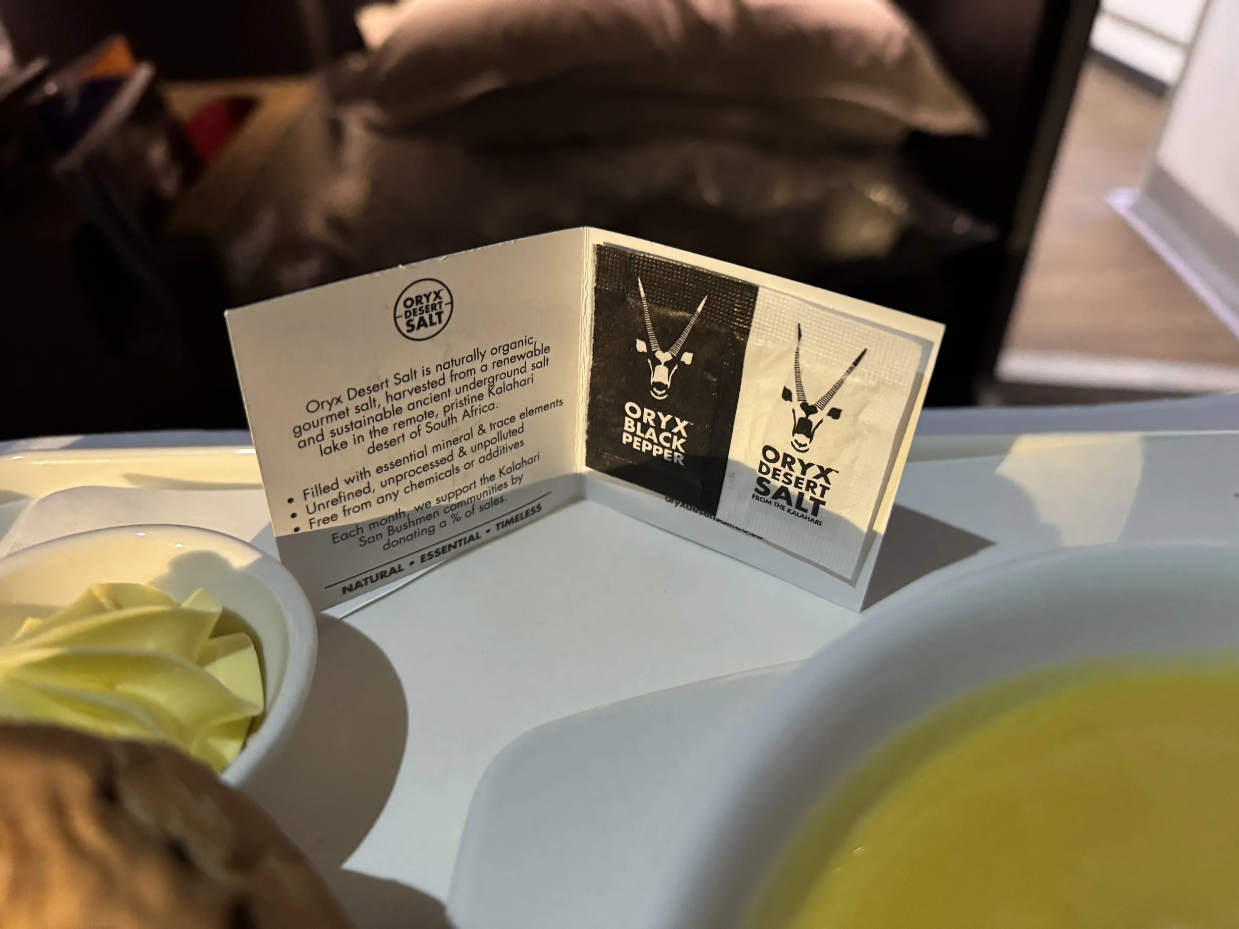 For whatever reason, there was no wine list - expect mostly South African wines, while champagne was Moët. Frankly, I would have preferred a MCC sparking, but nobody asked me. A welcome drink was served. We went with champagne and orange juice. The side of biltong was delicious. OMG I just remembered the biltong I had in this brewery (I know, but you can only drink so much wine) in Franschhoek. It was coated in like honey or like a syrup and had like chili flakes on it, and it was so yummy. Anyway…