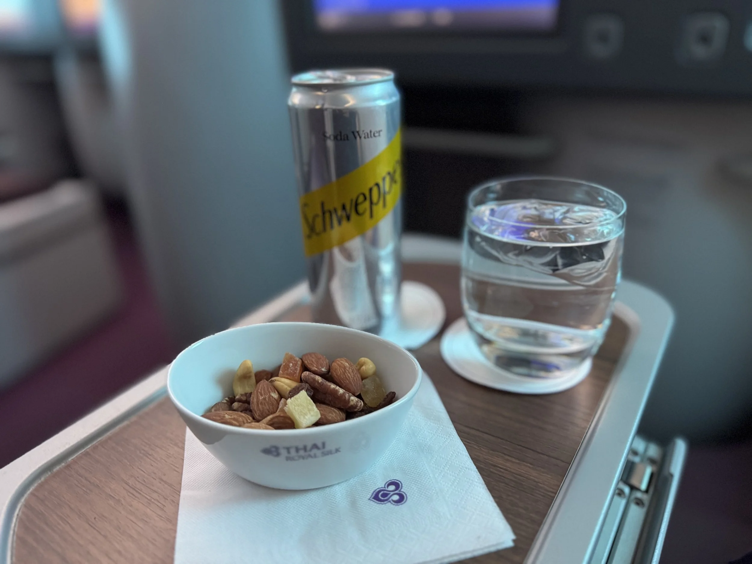 We had the shortest taxi I’d ever experienced at BKK, as we pushed back and went straight onto the runway. A round of apéritifs was served within 15 minutes of takeoff, along with another thick and scented towel and some mixed nuts. I just had a club soda. You know what I hate? Airlines that lock the dimmable Dreamliner windows. Thai Airways is one of them.