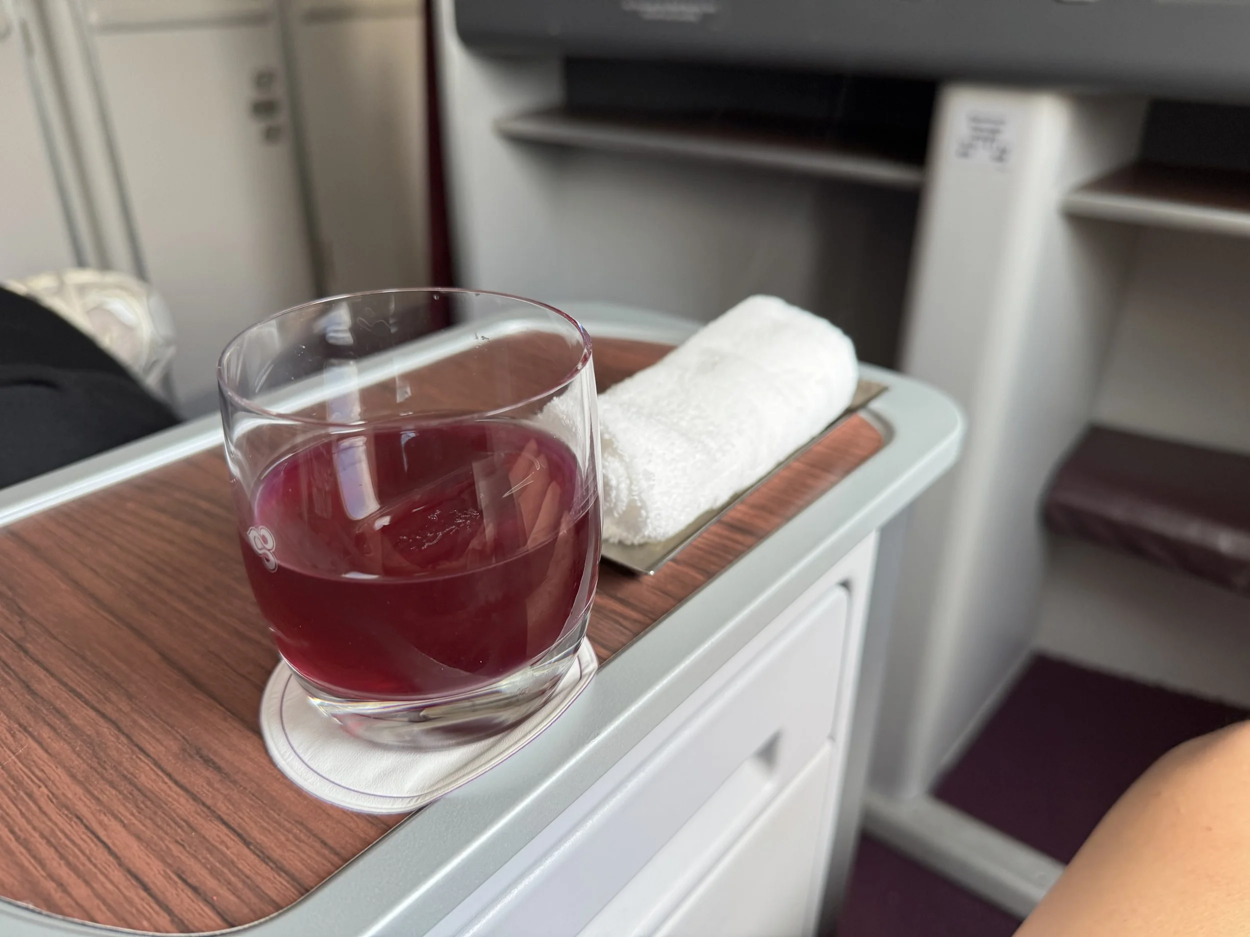Shortly after settling in, I was offered a welcome beverage and one of many thick and scented towels of this flight, which was served on a towel dish. I went with Thai’s signature butterfly pea tea.